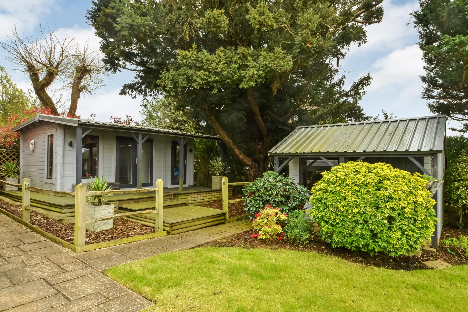 HOME OFFICE / SUMMER HOUSE 12' 4" x 12' 3" (3.76m x 3.73m) Chalet style, lighting, twin doors overlooking veranda with windows to side and rear aspect, wooden flooring.