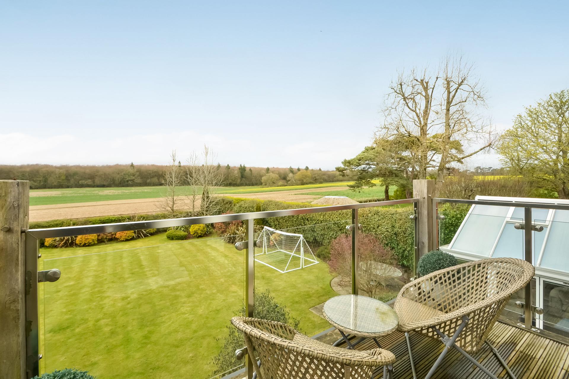 BALCONY Stainless steel balustrade with glazed panel fenders, outstanding views over rear garden, farmland and golf course.