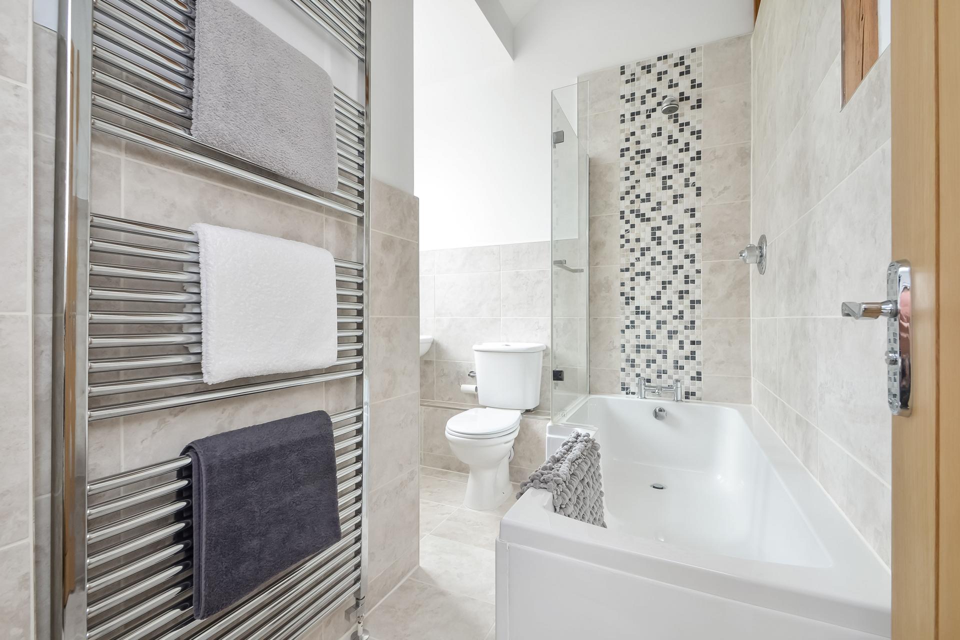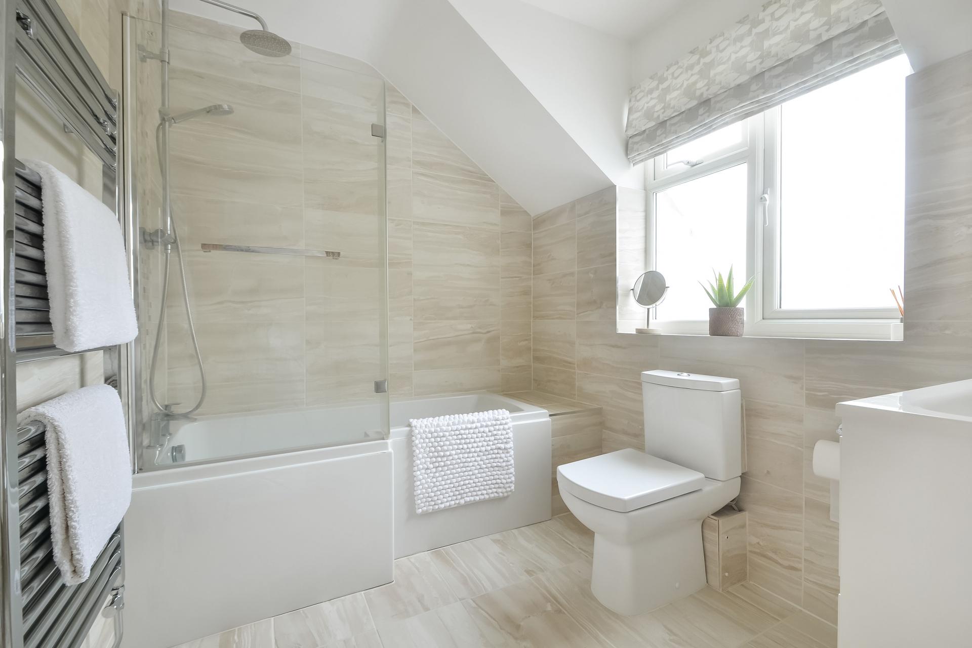 EN-SUITE BATHROOM White suite comprising: L shaped panelled bath with mixer tap, shower over with folding shower screen, close coupled w.c., corner wash hand basin, ceramic tiled surrounds, tiled flooring, chrome heated towel rail, double glazed frosted window to front aspect with arched window over, high level borrowed light window to providing natural light to hallway, extractor fan, ceiling spotlights.