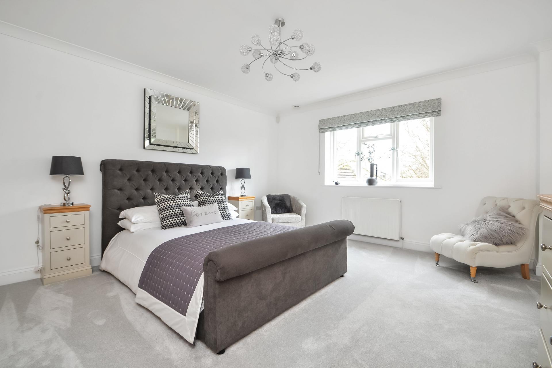 BEDROOM 2 14' 3" x 13' 5" (4.34m x 4.09m) Double glazed window to rear aspect overlooking garden, fields, woodland and golf course, ceiling coving, built-in wardrobe with hanging space and shelving, built-in bedside cabinet with wooden surface over, further chest of drawers with matching surface, door to: