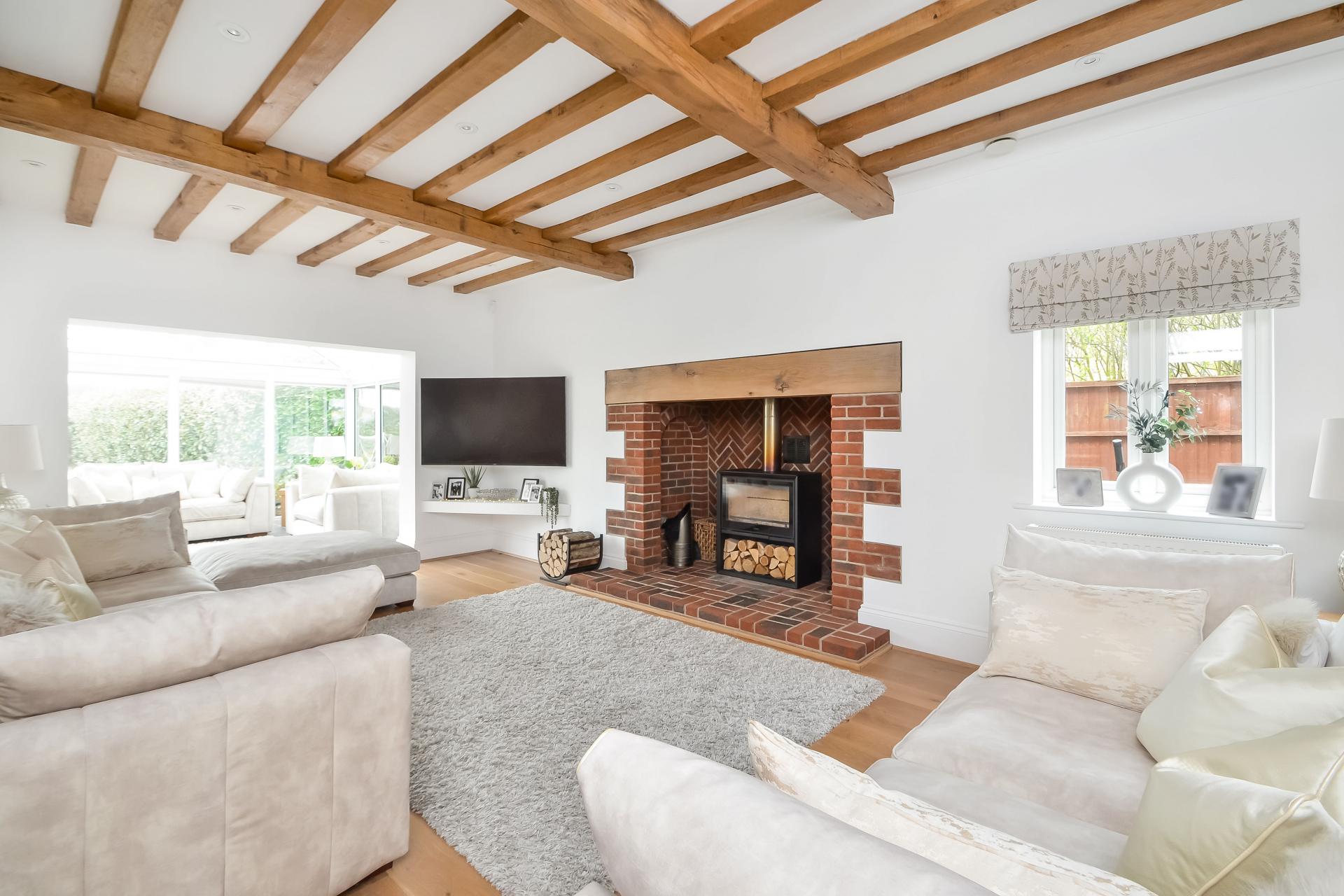 SITTING ROOM 21' 1" x 13' 4" (6.43m x 4.06m) Twin glazed doors leading to hallway, wooden flooring, double glazed window to side aspect with radiator under, exposed beams to ceiling, spotlights, inglenook style fireplace with herringbone brick inlay, wooden mantle over and brick hearth with central Contuna log burner with glass front, recessed arches to either side, corner shelf with bracket and wiring for wall mounted T.V., raised power points, square opening leading to:
