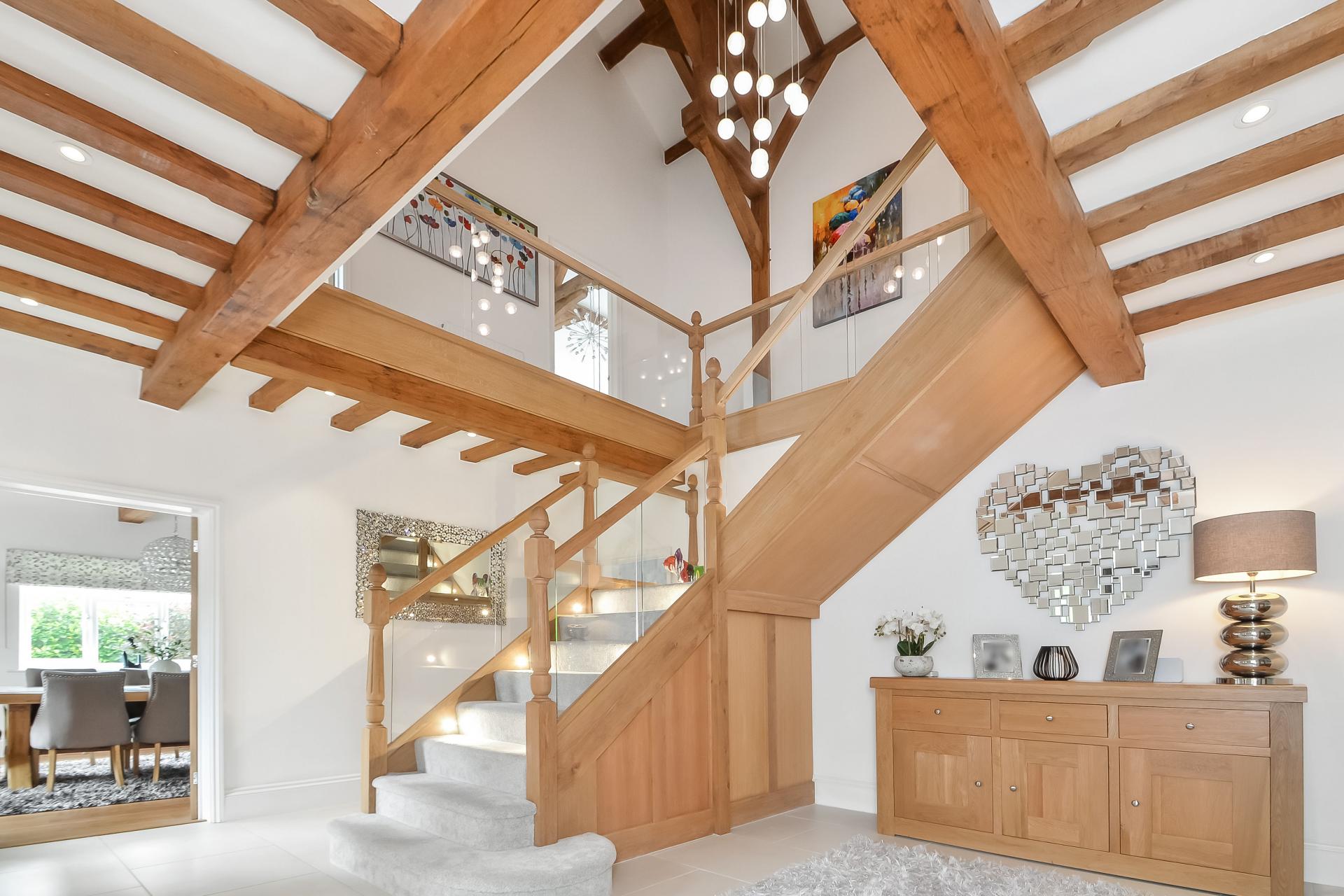 HALLWAY 16' 8" x 14' 10" (5.08m x 4.52m) Feature galleried landing over with vaulted ceiling max. height 27'7", twin double glazed doors with frosted panels to front aspect, to either side are arched openings with double glazed windows with radiators under, dimmer switches, doors to primary rooms, balustrade staircase with step lighting and glazed panels rising to first floor, exposed beams to ceiling, spotlights.