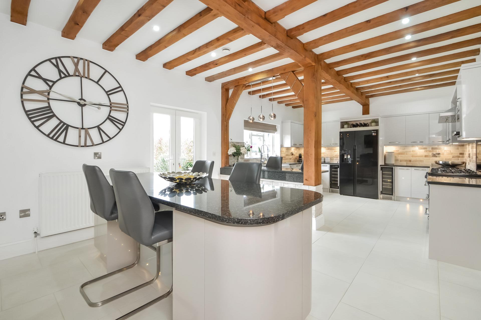 KITCHEN/BREAKFAST ROOM 24' 3" x 13' 6" (7.39m x 4.11m) Breakfast area: Central island with breakfast bar to one side and corner cupboards, radiator, twin double glazed doors leading to rear garden, exposed beams to ceiling, spotlights, door to utility room, tiled flooring, peninsular style divide with wooden supporting beams and spotlights, granite work surface leading to: