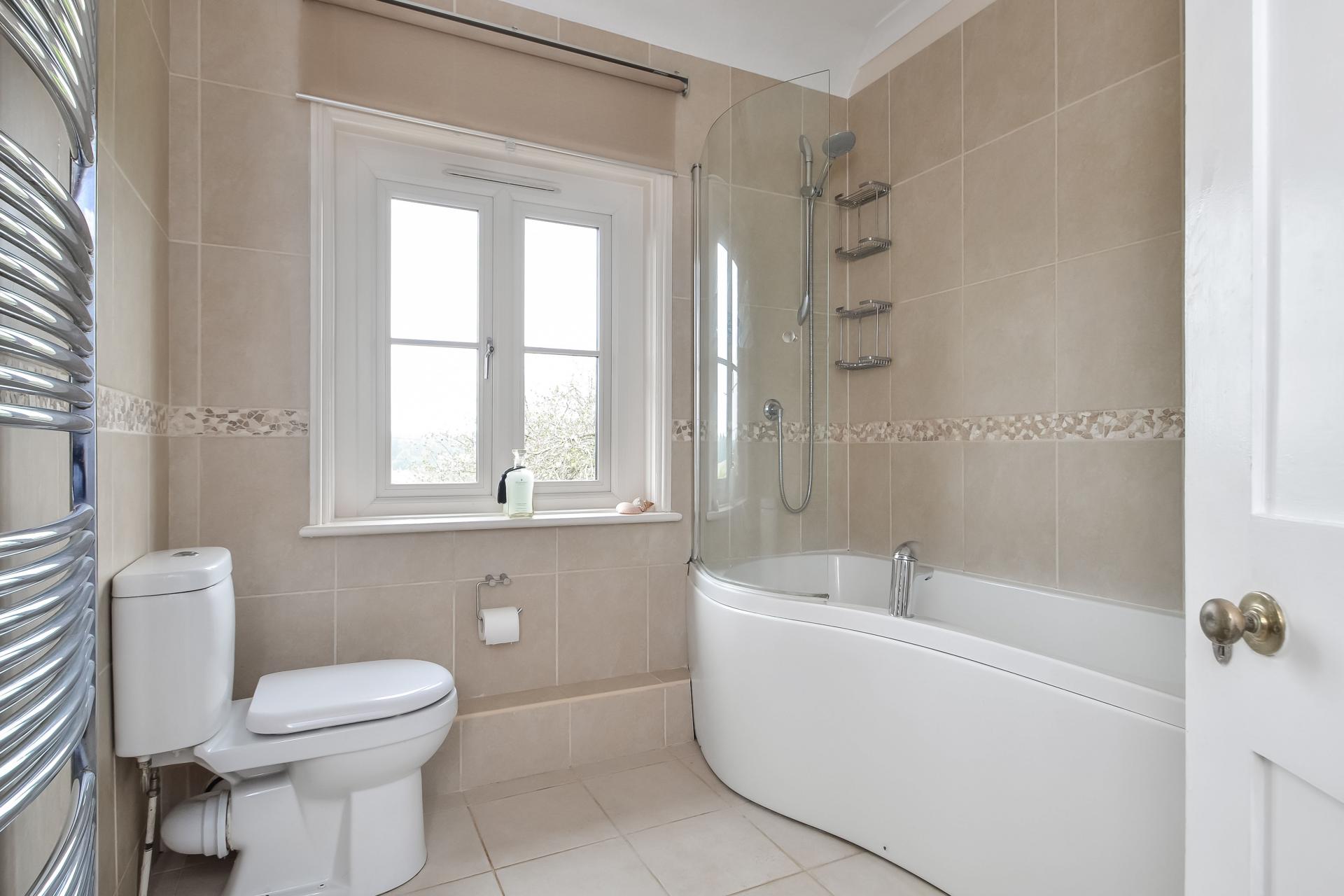 FAMILY BATHROOM 8' 3" x 7' 8" (2.51m x 2.34m) Fully ceramic tiled to floor and walls, white suite comprising: P shaped panelled bath with mixer tap, separate shower over with curved shower screen, vanity unit with oval wash hand basin and cupboard under, mirror fronted medicine cabinet with pelmet lighting over, low level w.c., large mirror with spotlights over, double glazed window to front aspect overlooking garden, tall chrome heated towel rail.