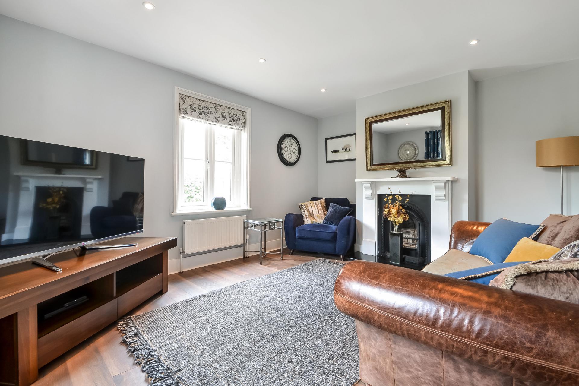 SITTING ROOM 15' 0" x 12' 1" (4.57m x 3.68m) Central chimney breast with wood surround fireplace with cast iron arched inlay and marble hearth, wood laminate flooring, matching double windows to side and front aspects overlooking garden with radiators under, panelled door, ceiling spotlights.