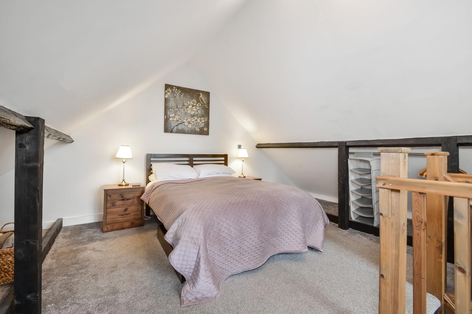 BEDROOM 19' 3" x 18' 0" (5.87m x 5.49m) Eaves to side ceilings restricting headroom, maximum ceiling height 8'4", double glazed window to front aspect with views over driveway, farmland and woodland beyond, painted black beams with extensive storage into eaves.