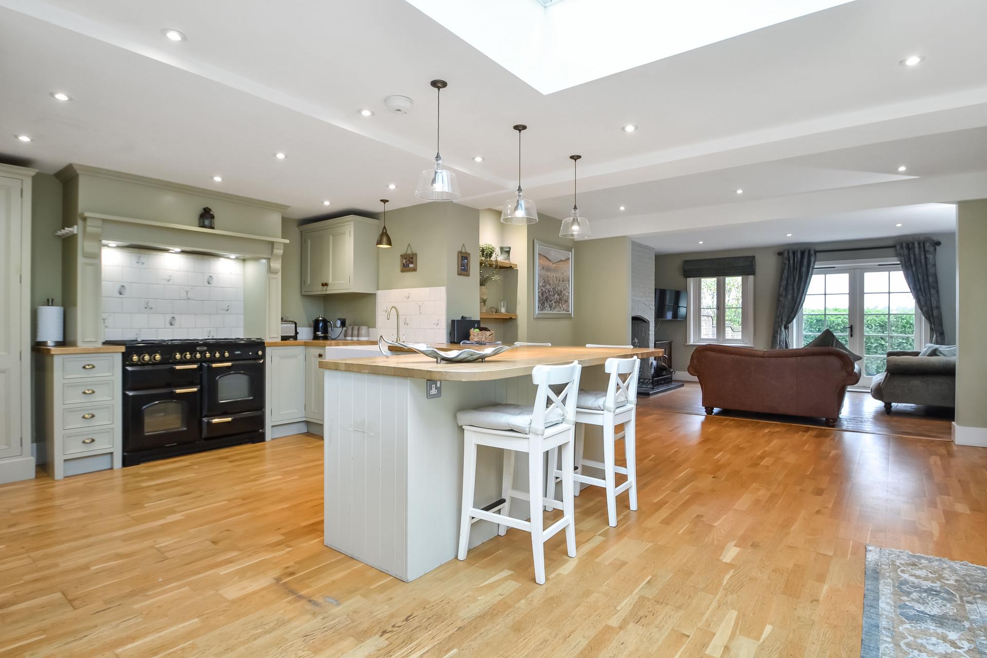 KITCHEN / DINING ROOM 23' 8" x 25' 4" decreasing to 16'3" at narrowest point. (7.21m x 7.72m) Wooden flooring, door to hallway, dimmer switch, ceiling spotlights, L shaped breakfast bar peninsular style divide with wood block work surface leading to kitchen, matching wooden flooring, range of wall and floor units with wood block work surface, inset 2½ bowl Villeroy and Bosch butler style sink with mixer tap, integrated dishwasher with matching door, range of pan drawers, over unit lighting, recessed chimney breast with space for Rangemaster free standing cooker with drawers to one side and cupboards to the other, inset lighting over, ceramic tiled splashback, tall larder style cupboard with range of shelving, space for American style fridge/freezer, glazed panelled door leading to utility/boot room.