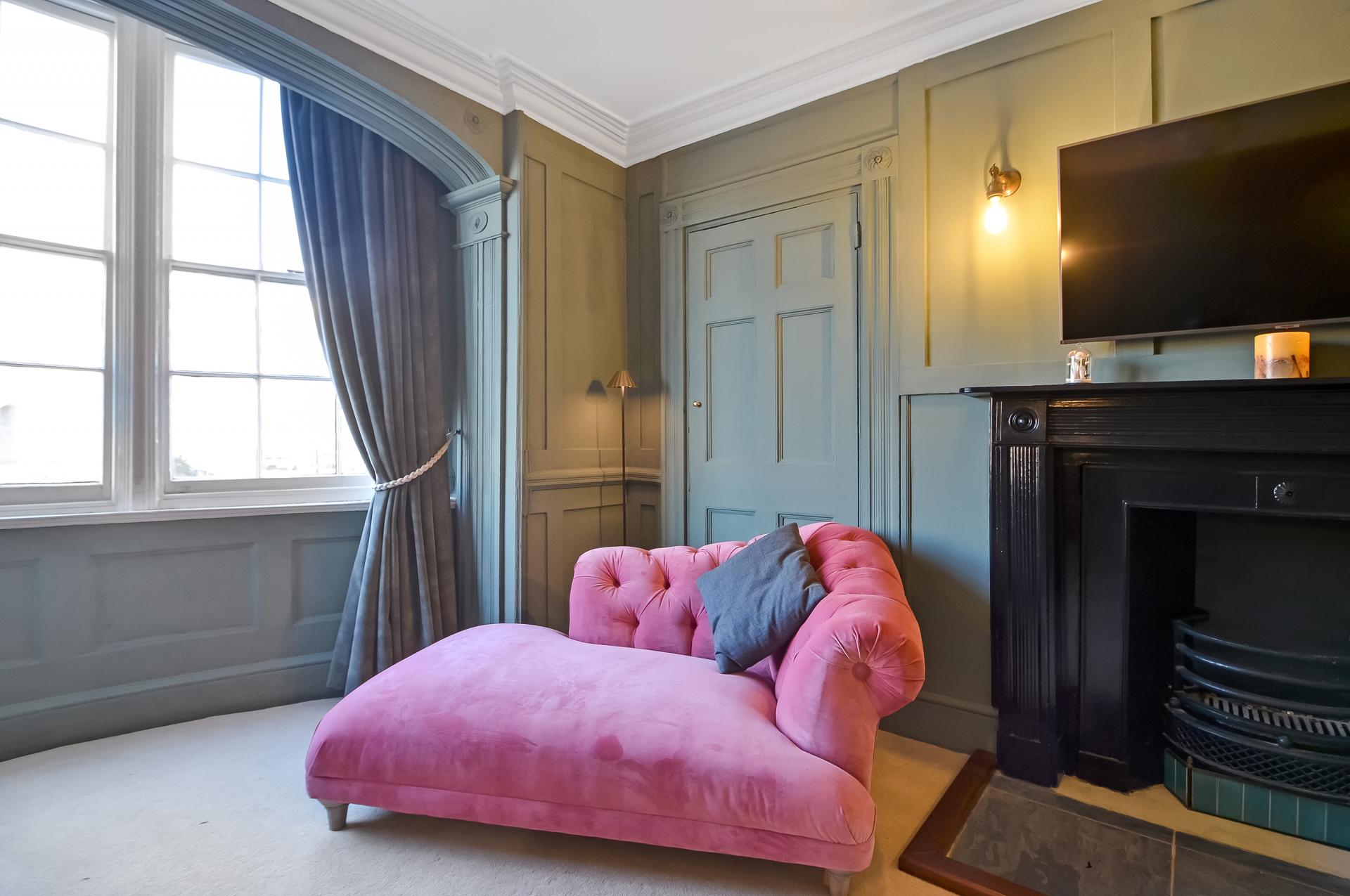 SITTING ROOM 17' 7" into bay window x 15' 0" to front of built-in cupboards (17'4" max) (5.36m x 4.57m) Feature bow bay sash window to front aspect with views over Camber Dock & The Camber Building, Gunwharf Quays and the Spinnaker Tower, panelling on all walls, wall lights, two double roll top radiators, central chimney breast with fire surround, slate hearth, built-in cupboards to either side of chimney breast with panelled doors, painted panelling to walls, sloping floor.