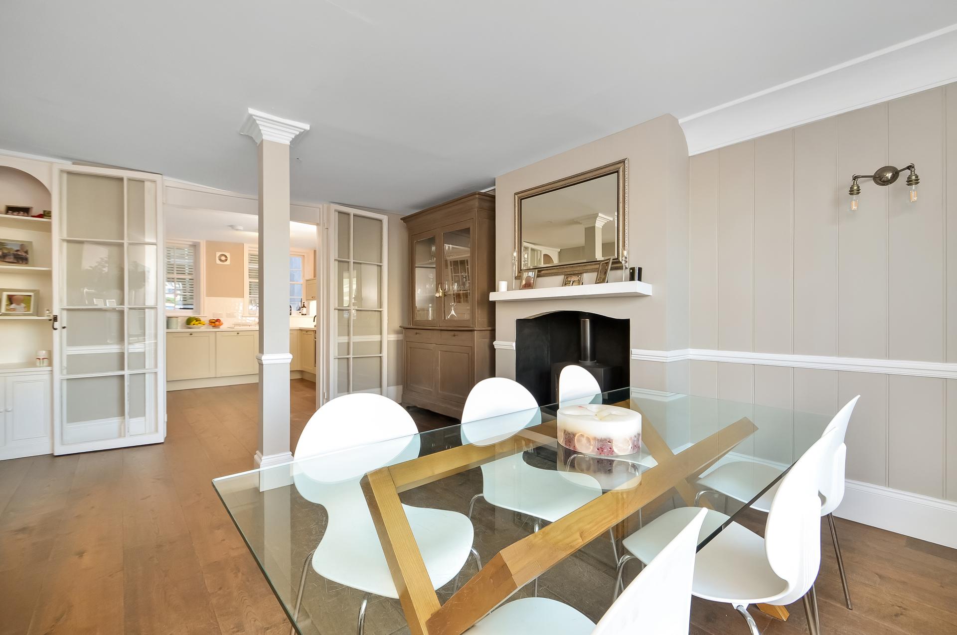 DINING ROOM 17' 9" x 13' 5" (5.41m x 4.09m) Sash window to front aspect with views towards the Camber, Dock & The Camber Building, tongue and groove panelling to two walls, dado rail, two roll top radiators, wooden flooring, wall lights, door to hallway with brass furniture, centralised supporting pole, central chimney breast with wooden mantle, log burner and slate hearth, twin glazed doors leading to kitchen, recessed area with curved inlay and shelving with cupboards under.