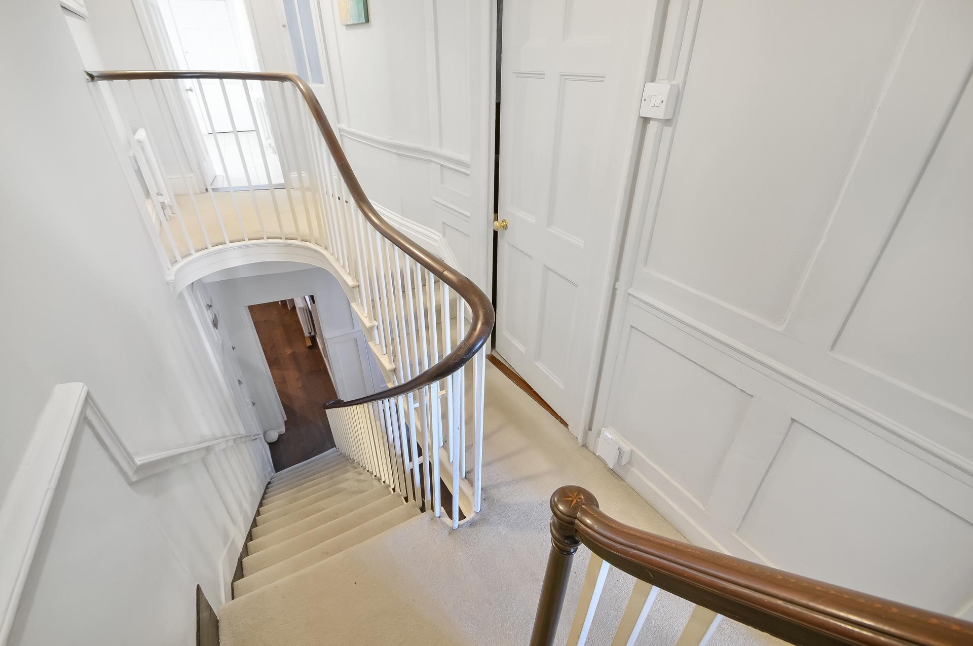 FIRST FLOOR Landing with balustrade, separate staircase rising to upper level, curved wood balustrade and radiator, ceiling coving.