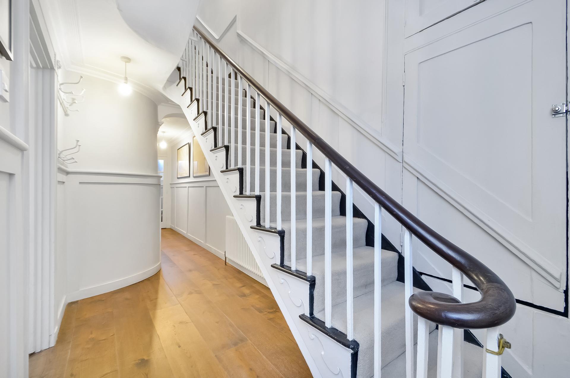 HALLWAY Matching wooden flooring, further archway with matching mouldings, roll top radiator, balustrade staircase rising to first floor, glazed panelled door leading to courtyard style garden, matching panelling to dado rail level with feature curved wall, cornicing, built-in narrow cupboard housing gas and electric meters and range of shelving, doors to primary rooms, feature architraves.