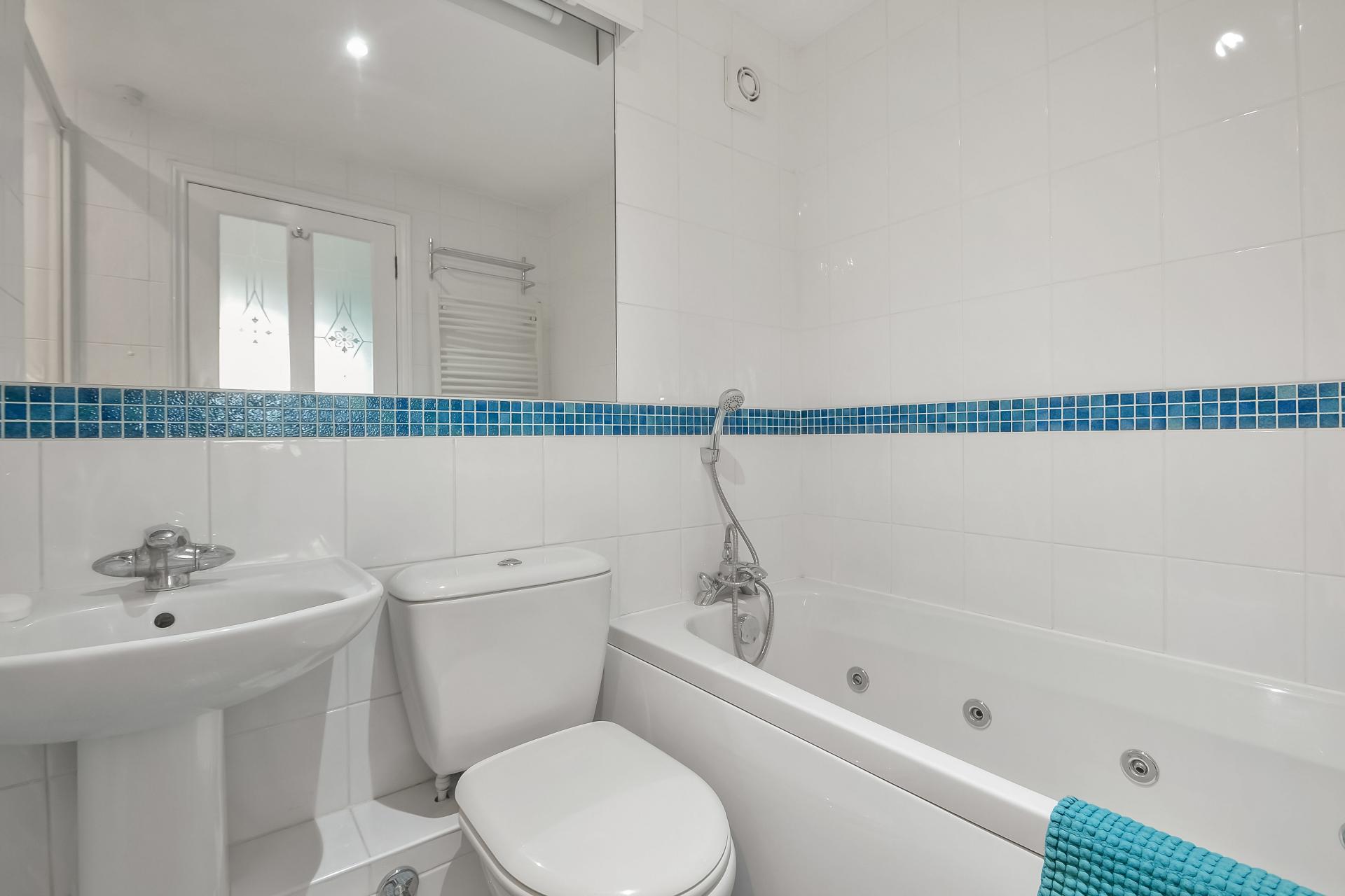 EN-SUITE BATHROOM White suite comprising: Jacuzzi style bath with mixer tap and shower attachment, fully ceramic tiled to walls, extractor fan, large mirror with lighting over, pedestal wash hand basin with mixer tap, close coupled w.c., mosaic tiled flooring, fully ceramic tiled shower cubicle with panelled door, heated towel rail.