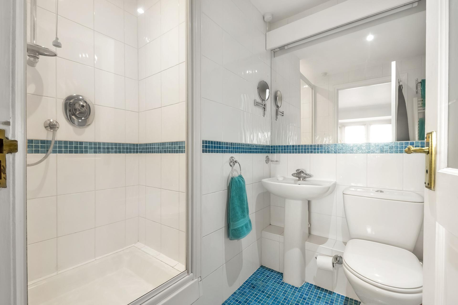 EN-SUITE SHOWER ROOM Fully ceramic tiled shower cubicle with folding door, ceiling spotlights, extractor fan, fully ceramic tiled to walls, mosaic tiled flooring, pedestal wash hand basin with mirror and light over, close coupled w.c., built-in storage cupboard with shelving over.