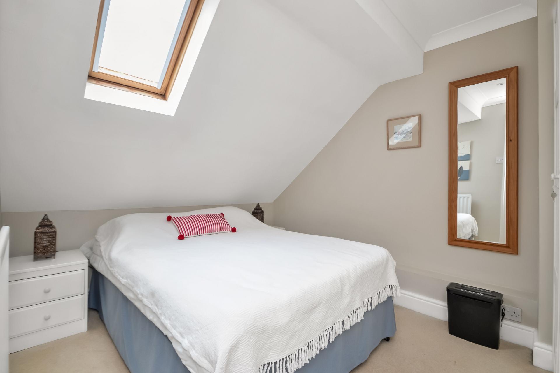 BEDROOM 4 10' 3" x 8' 6" (3.12m x 2.59m) Measurements taken from approximately 2'6" off floor level with eaves to rear ceiling restricting headroom, ceiling spotlights and coving, Velux skylight window with blind, radiator.