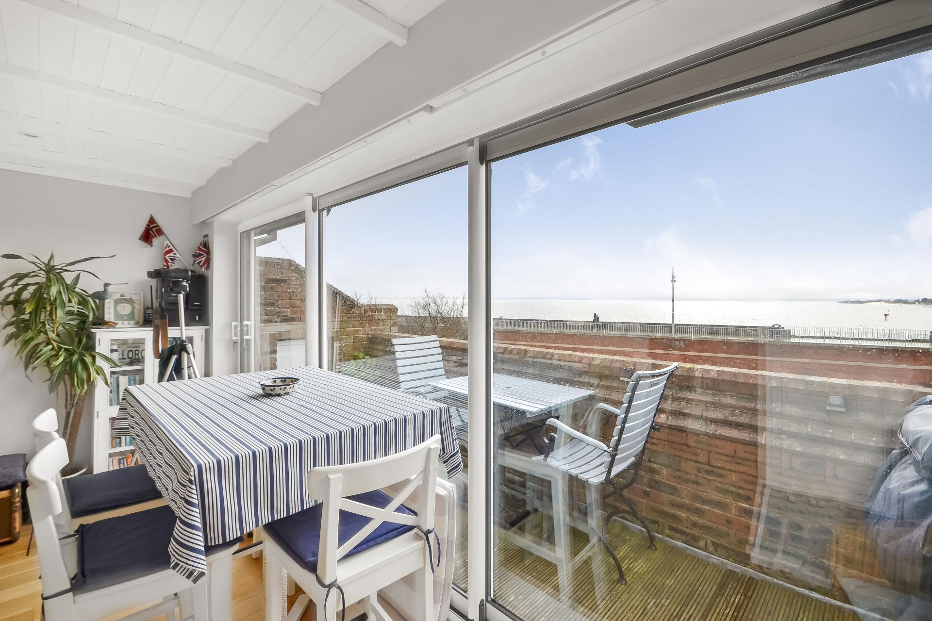 BEDROOM 2 / VIEWING ROOM 15' 3" x 11' 0" (4.65m x 3.35m) Wood flooring, painted panelling to ceiling with spotlights, sliding full width doors leading to balcony with outstanding views towards the Napoleonic sea defence, the Solent, Isle of Wight and Gosport in the distance, louvre doored built-in cupboard with mini sink and mixer tap, range of storage cupboards and shelving for kitchenette, radiator.