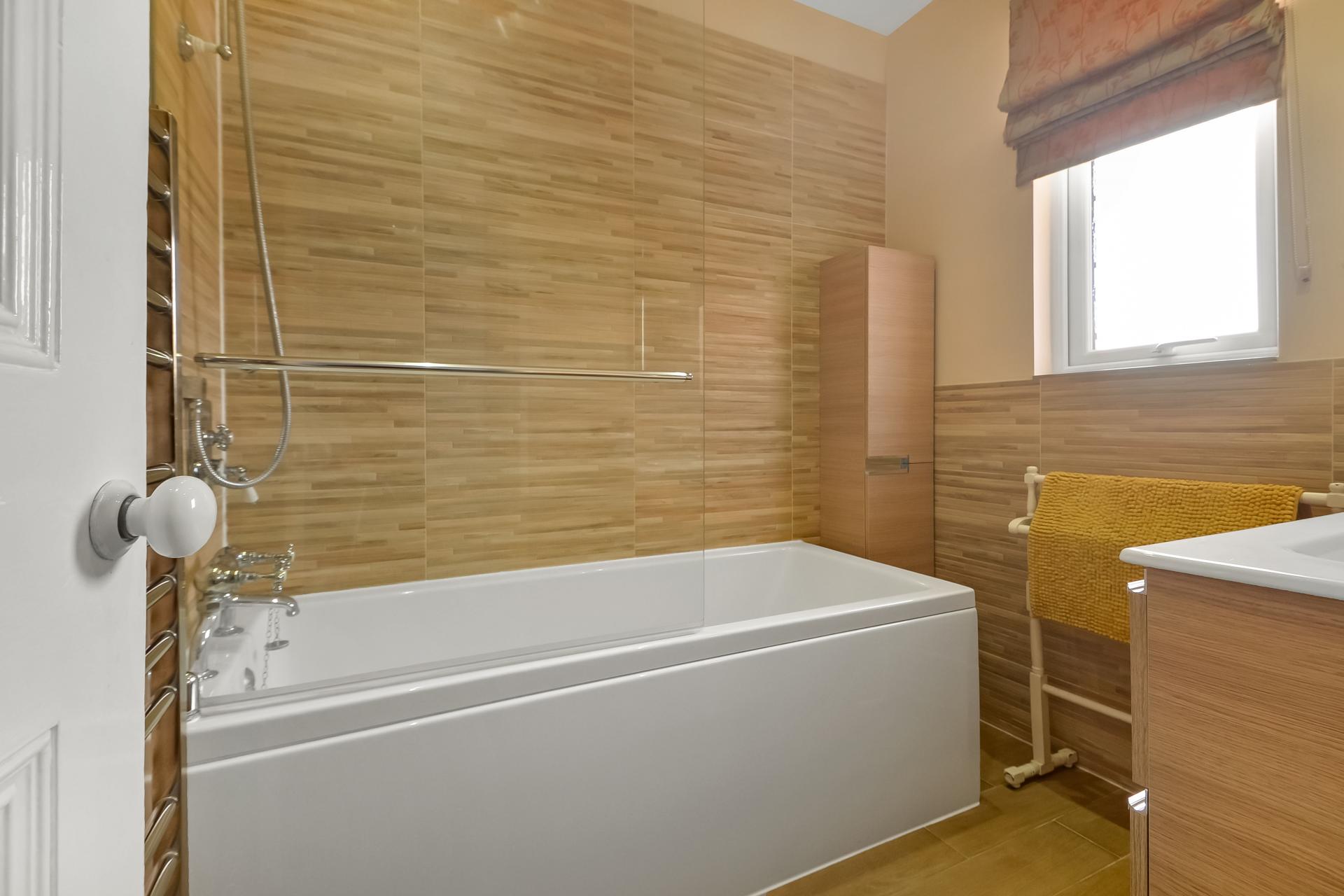 FAMILY BATHROOM White suite comprising; panelled bath with mixer tap, separate shower over with folding screen, wash hand basin with cupboards under, mirror and lighting over, ceramic tiled surrounds, tile wood effect flooring, chrome heated towel rail.