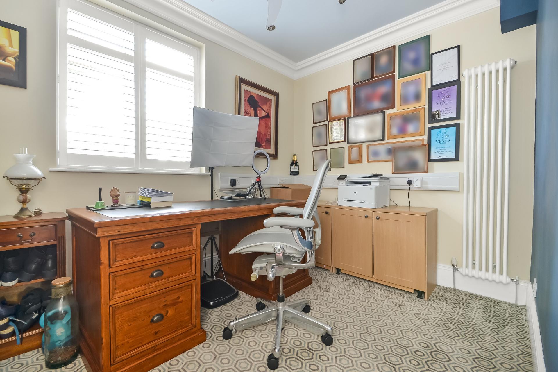 STUDY 11' 8" x 8' 3" (3.56m x 2.51m) Double glazed window to rear aspect with plantation shutter blinds, recess for bookshelves, high level power points, tall contemporary style radiator (hidden plumbing for conversion to en-suite if required), hard wired internet point, ceiling spotlights and coving.