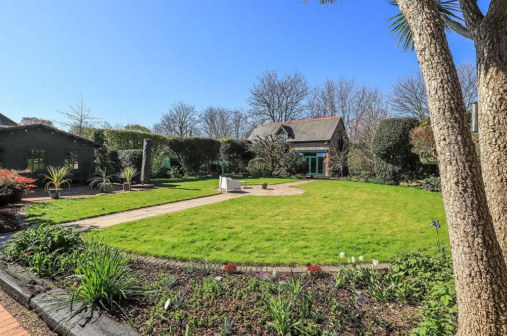 To the rear, the large garden is mature and well-tended with a central feature pathway through the lawn towards the Coach House. There are pleasant patio areas and a detached timber garden room from where to enjoy some sun or shade. At the end of the garden there is a gate to a wooded area which leads onto The Hayling Billy Trail. Ideal for surfing or kayaking.