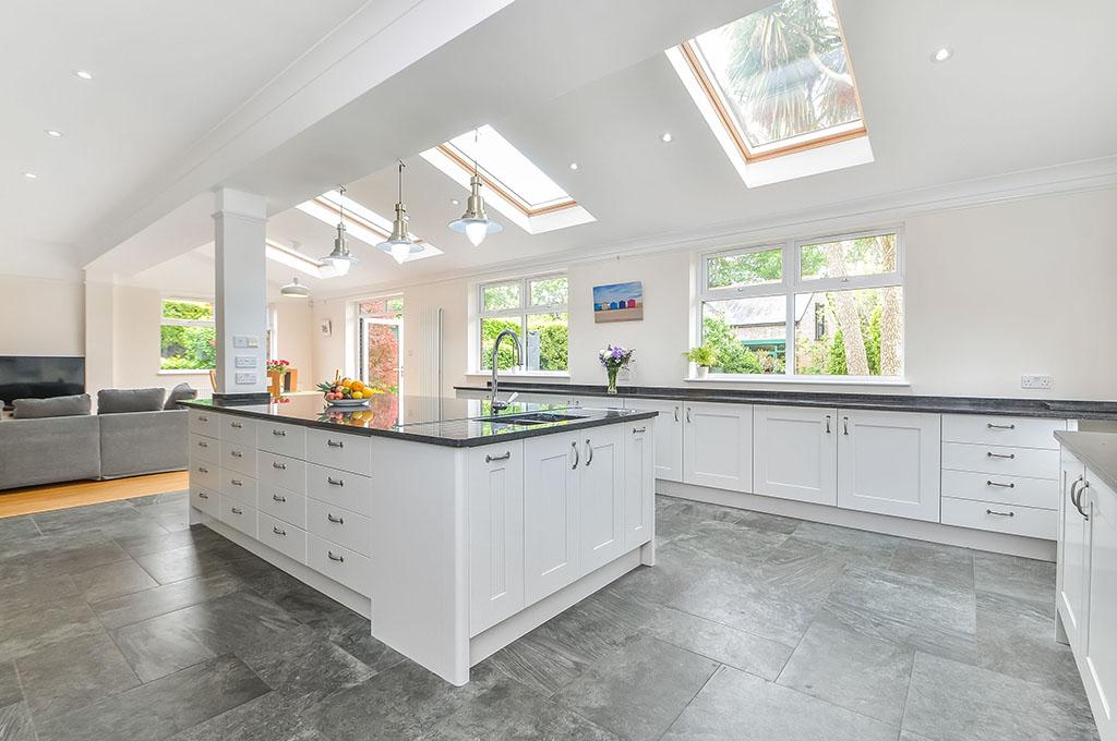 At the back of the house is the open-plan Kitchen/Family/Dining Room (almost 22 ft long x 24 ft at its widest). With glass patio doors, large windows and four skylights, this whole area benefits from a great deal of light.