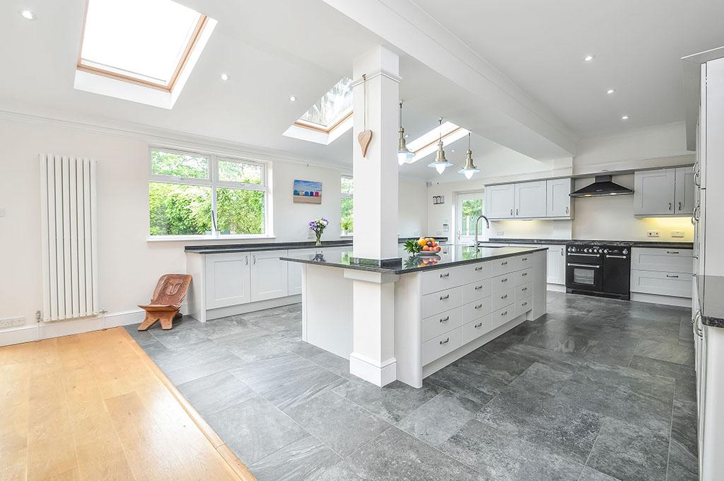 The Kitchen which has been refitted with a vast array of light-grey painted wooden units, under black granite worktops. There is an extensive central island with inset sink, concealed bins, integrated dishwasher and an extensive range of storage. There is a Rangemaster gas-fired cooker with extractor over and tower units housing the fridge, freezer and microwave. A part-glazed door gives access from the driveway.