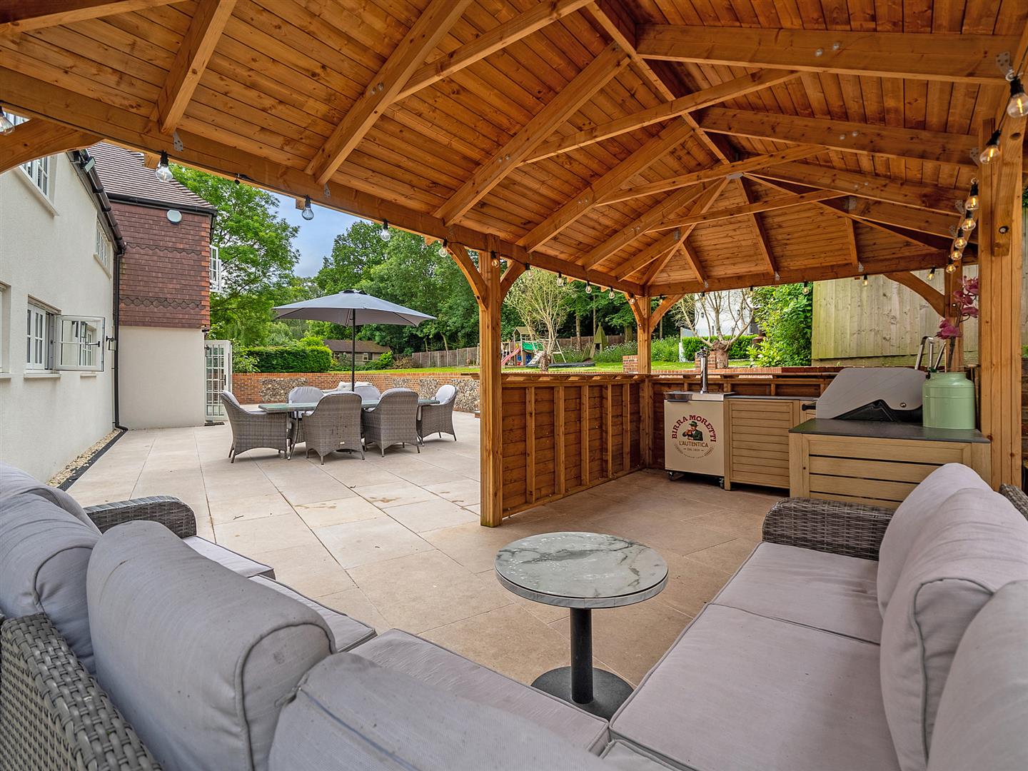 The property's exterior features an expansive outdoor entertainment area with a built-in BBQ and a sunken hydro pool jacuzzi, ideal for al fresco dining and leisure. A separate one-bedroom annex, complete with a fitted kitchen and bathroom, offers potential for independent living or could serve as a guest suite. There is agreed permitted development to convert the annex into a separate dwelling.