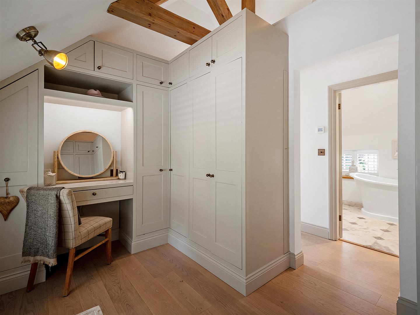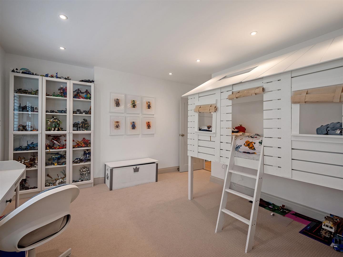 The master suite boasts a Juliet balcony, a dressing room, and an en-suite adorned with Parisian marble tiles. From this vantage point, enjoy views across the countryside with the London skyline serving as a distant backdrop.