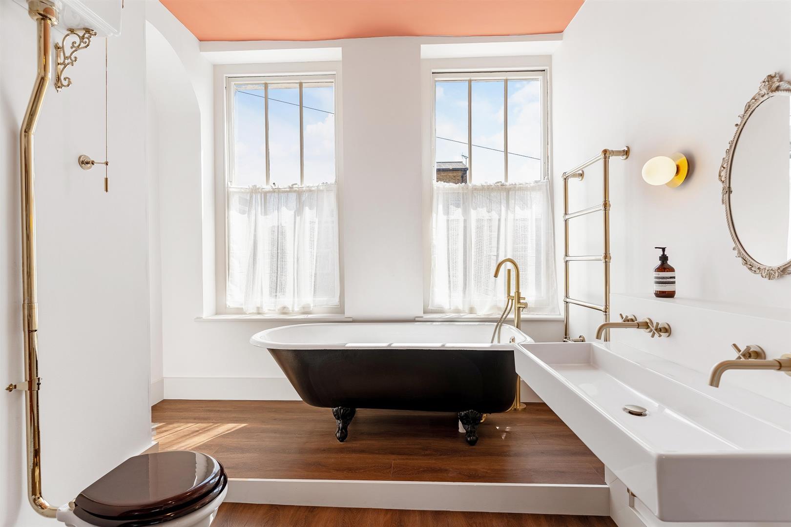 The expansive master suite overlooks the garden and includes a luxurious en-suite bathroom, complete with an original Victorian freestanding bath and walk-in shower.