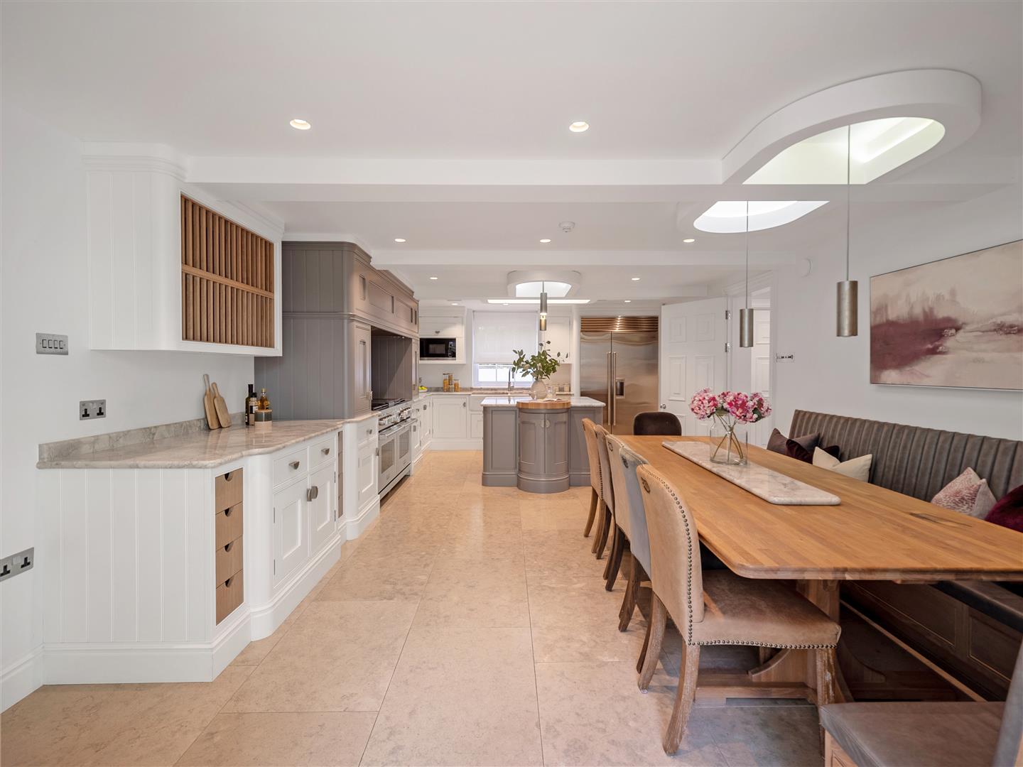 The accommodation is arranged over generous proportions, featuring six bedrooms and three bathrooms, complemented by elegant reception rooms and a bespoke kitchen designed for both family life and entertaining. A gymnasium and double garage add to the lifestyle appeal, while the house opens out onto a substantial landscaped garden, ideal for relaxation and outdoor gatherings.