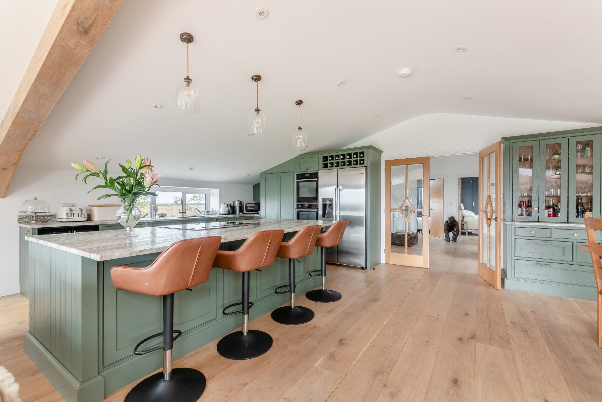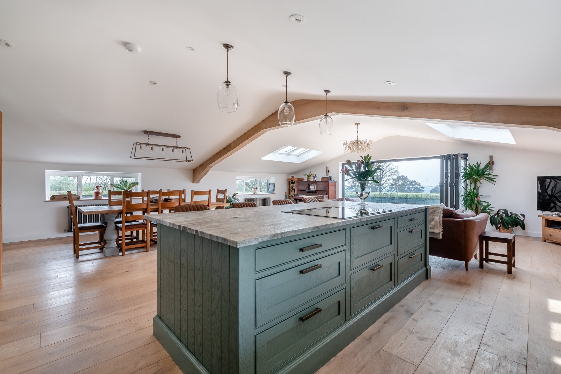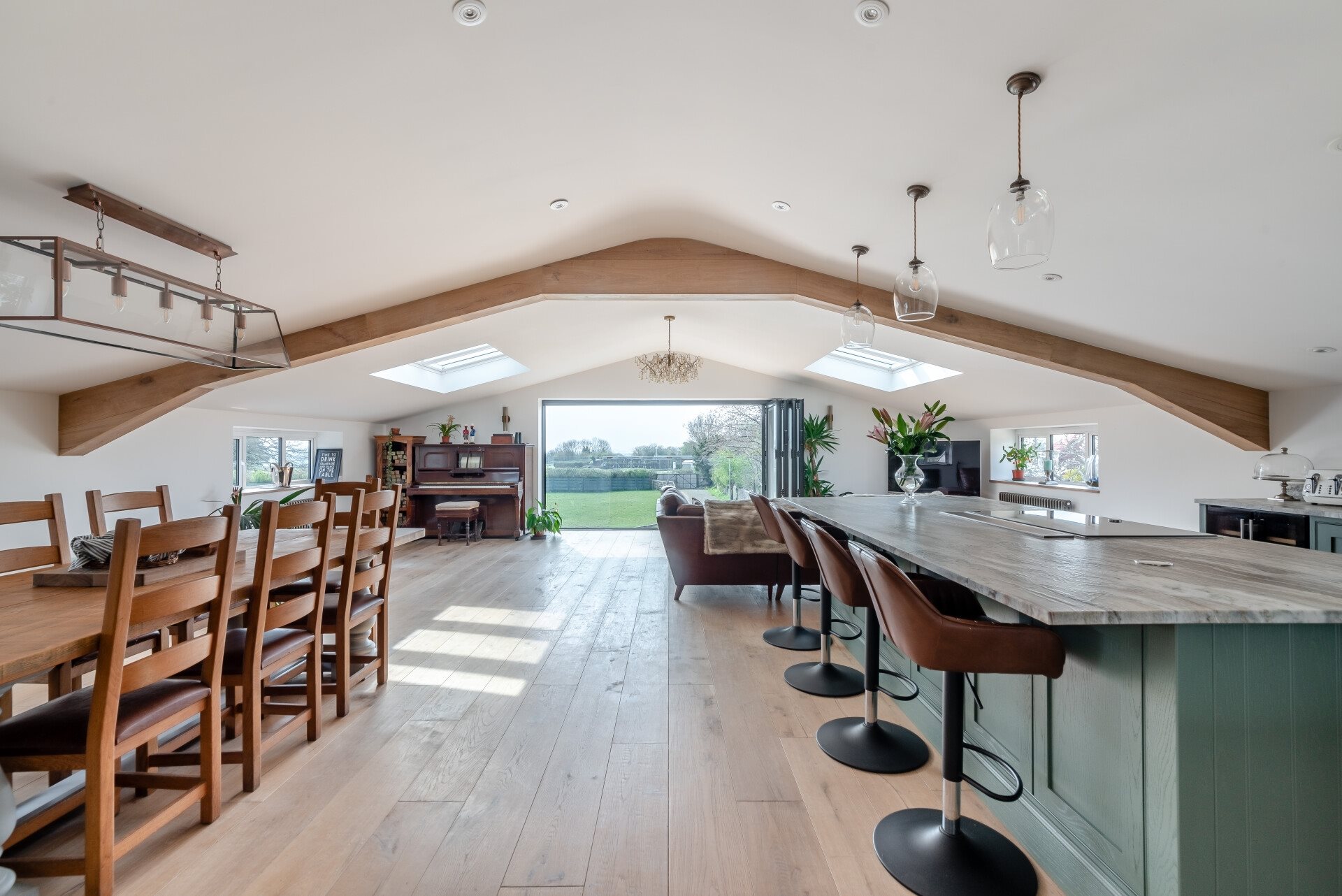 This beautifully designed barn conversion spans two floors and offers a spacious and flexible layout, ideal for modern family living. The heart of the home is the generous open-plan kitchen and living area, which is flooded with natural light and frames the breathtaking views over the parkland grounds. Large bi-folding doors seamlessly connect the interior with the outdoors, offering the perfect setting for both family time and entertaining guests.