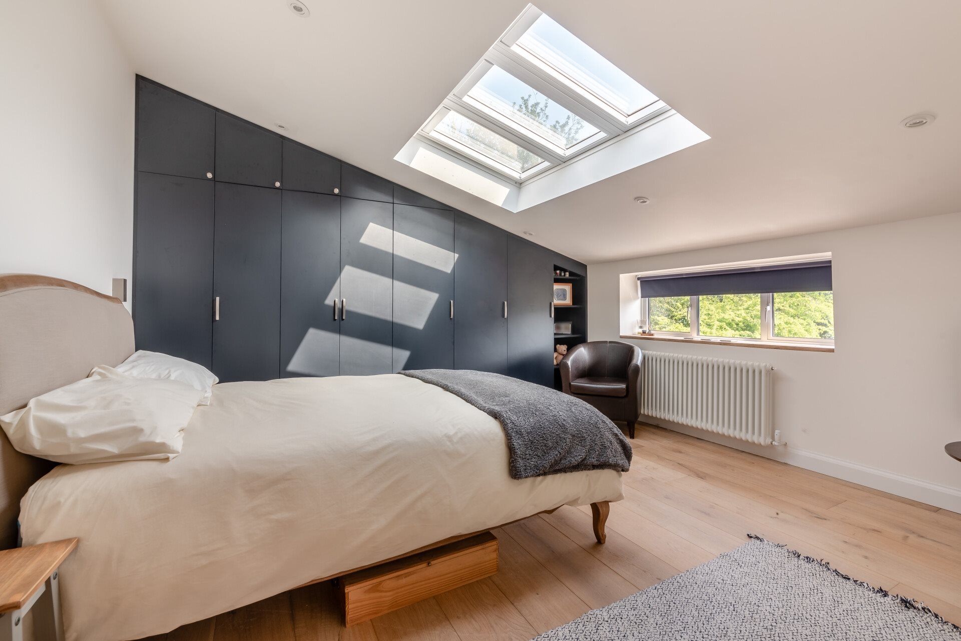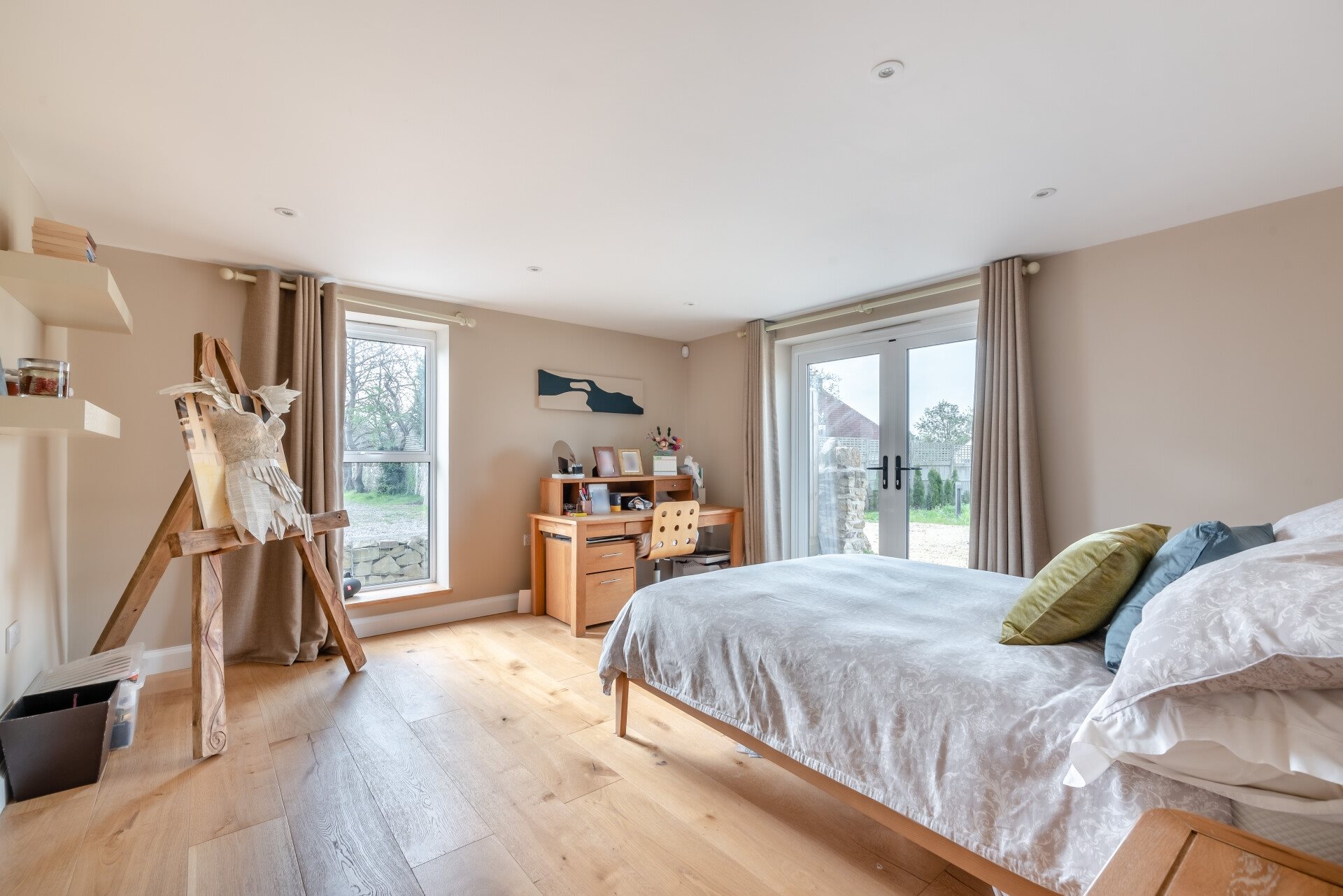 The home's eco-conscious design includes air-source heating, underfloor heating throughout, solar panels, and double-glazed windows, ensuring energy efficiency while maintaining a comfortable and inviting atmosphere.