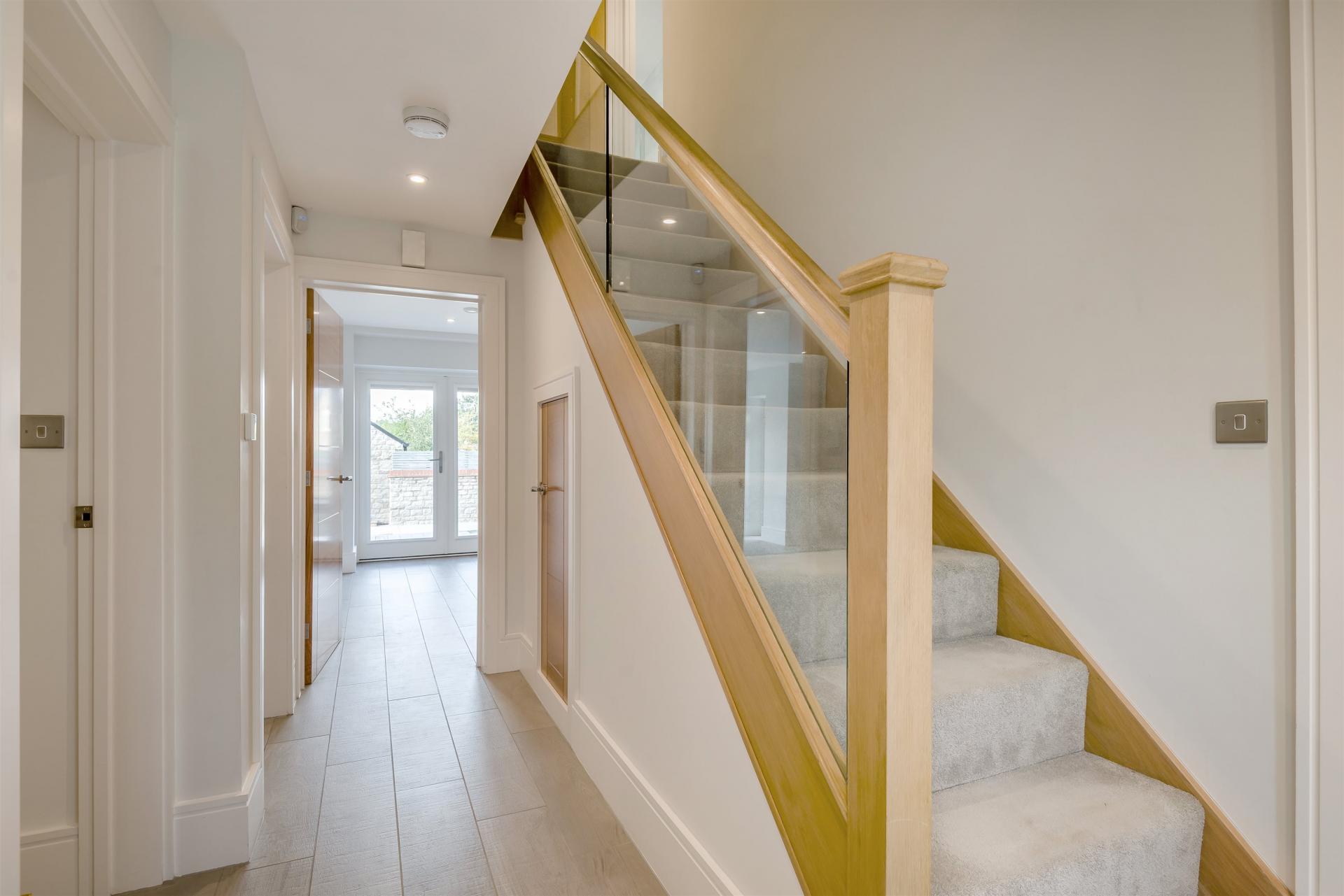 A neatly landscaped, shrublined pathway leads to the front entrance. Stepping inside, you are greeted by an inviting hallway, where a striking glass balustrade frames the staircase and immediately showcases the home's sense of style and attention to detail.