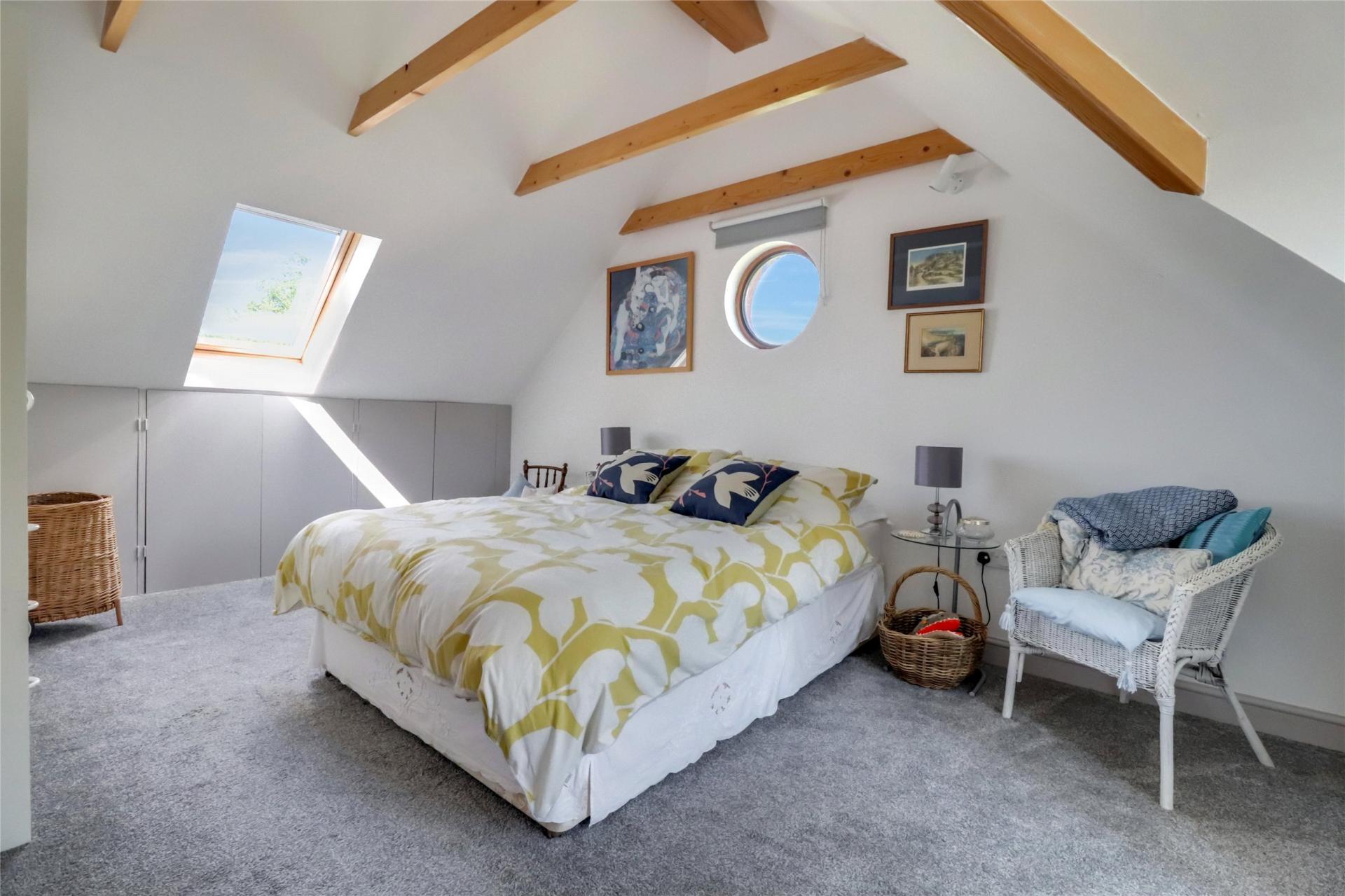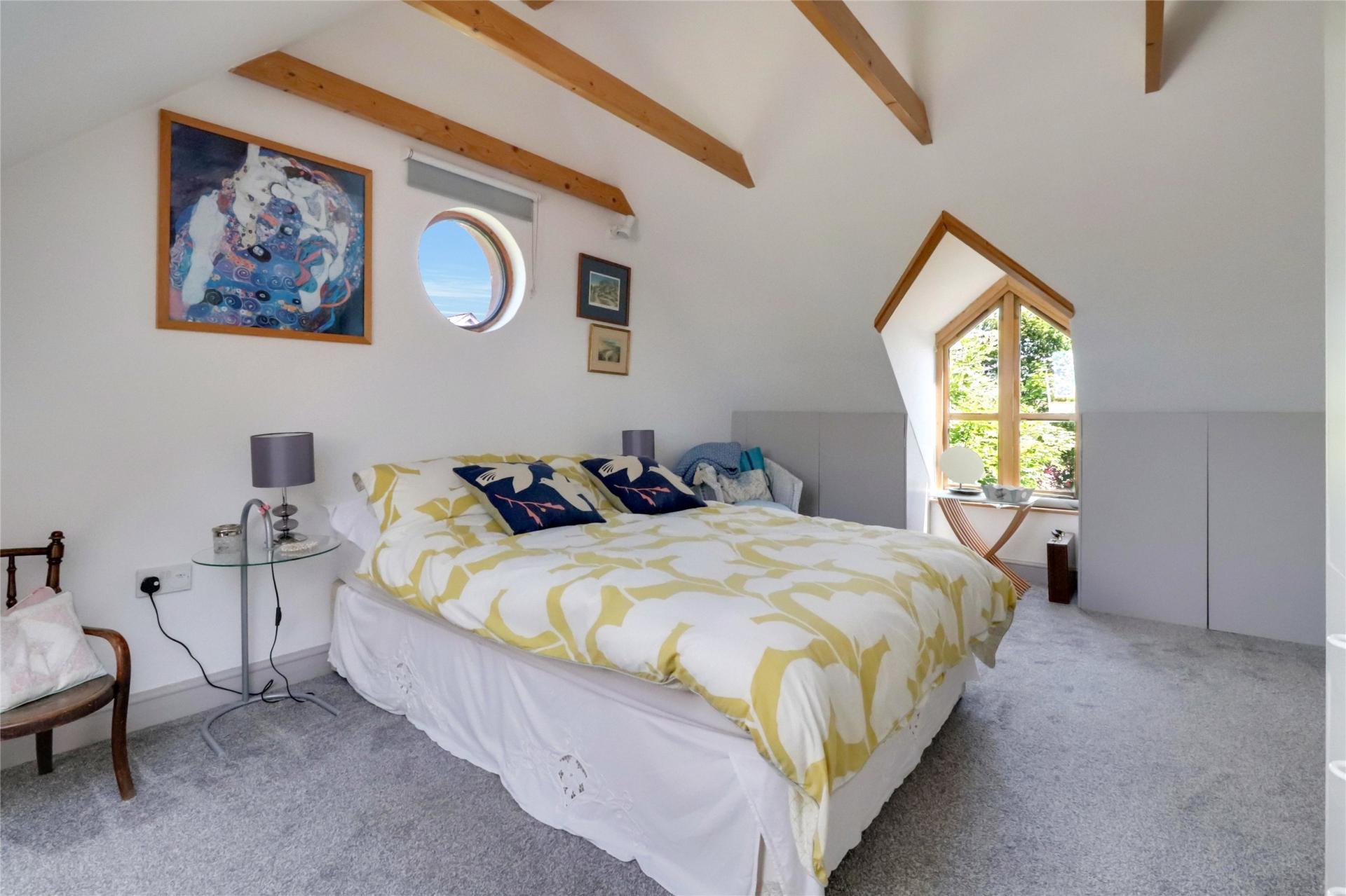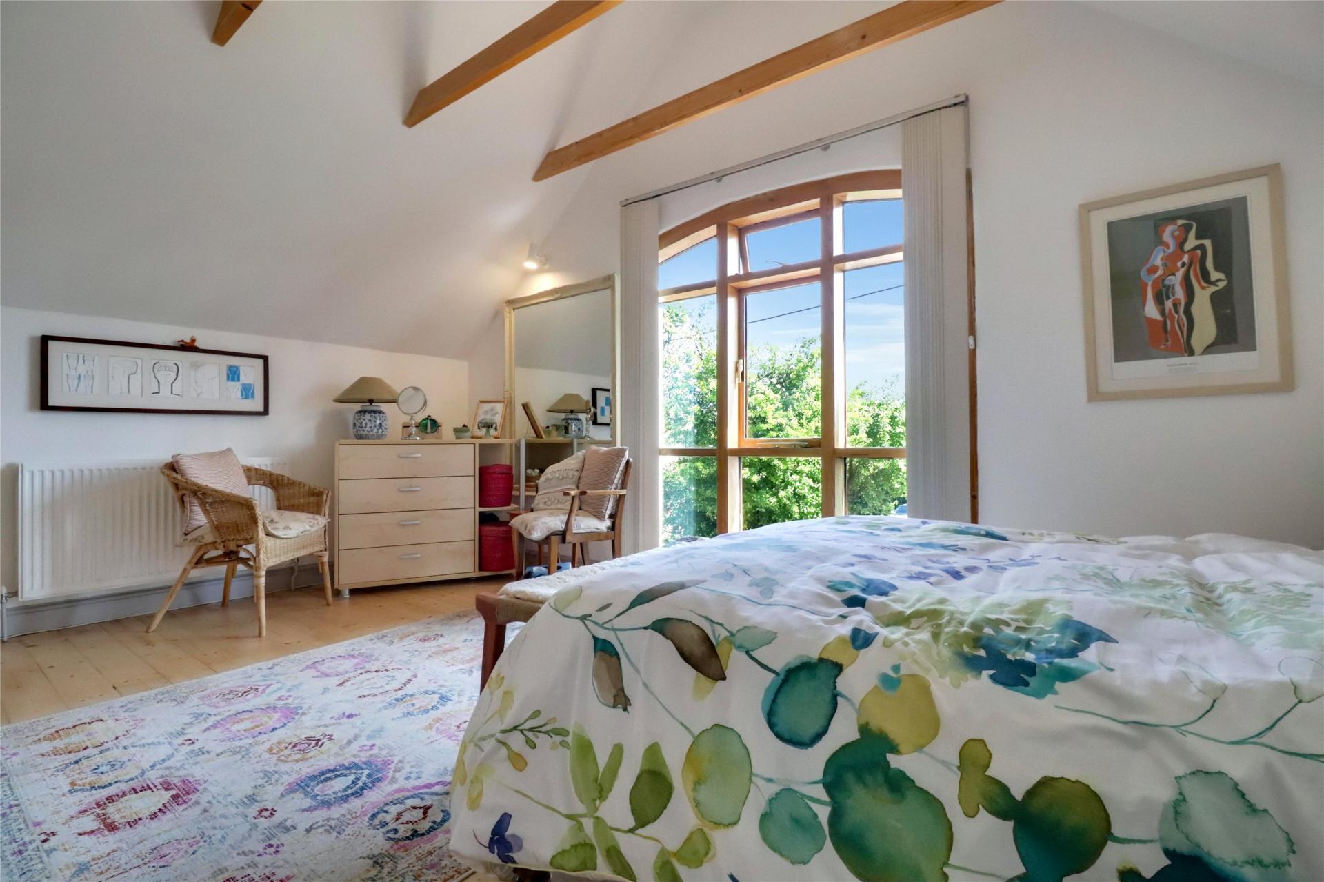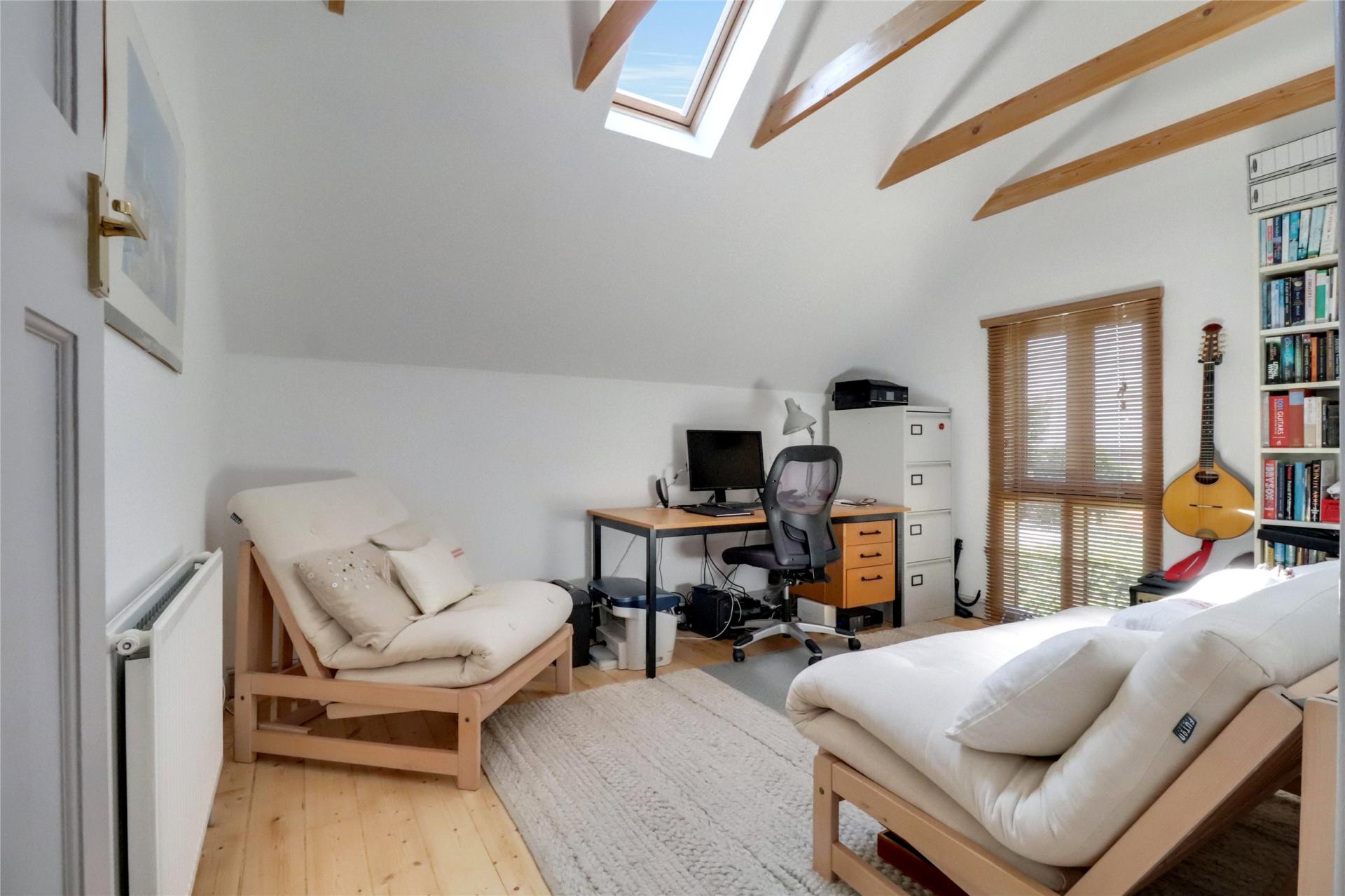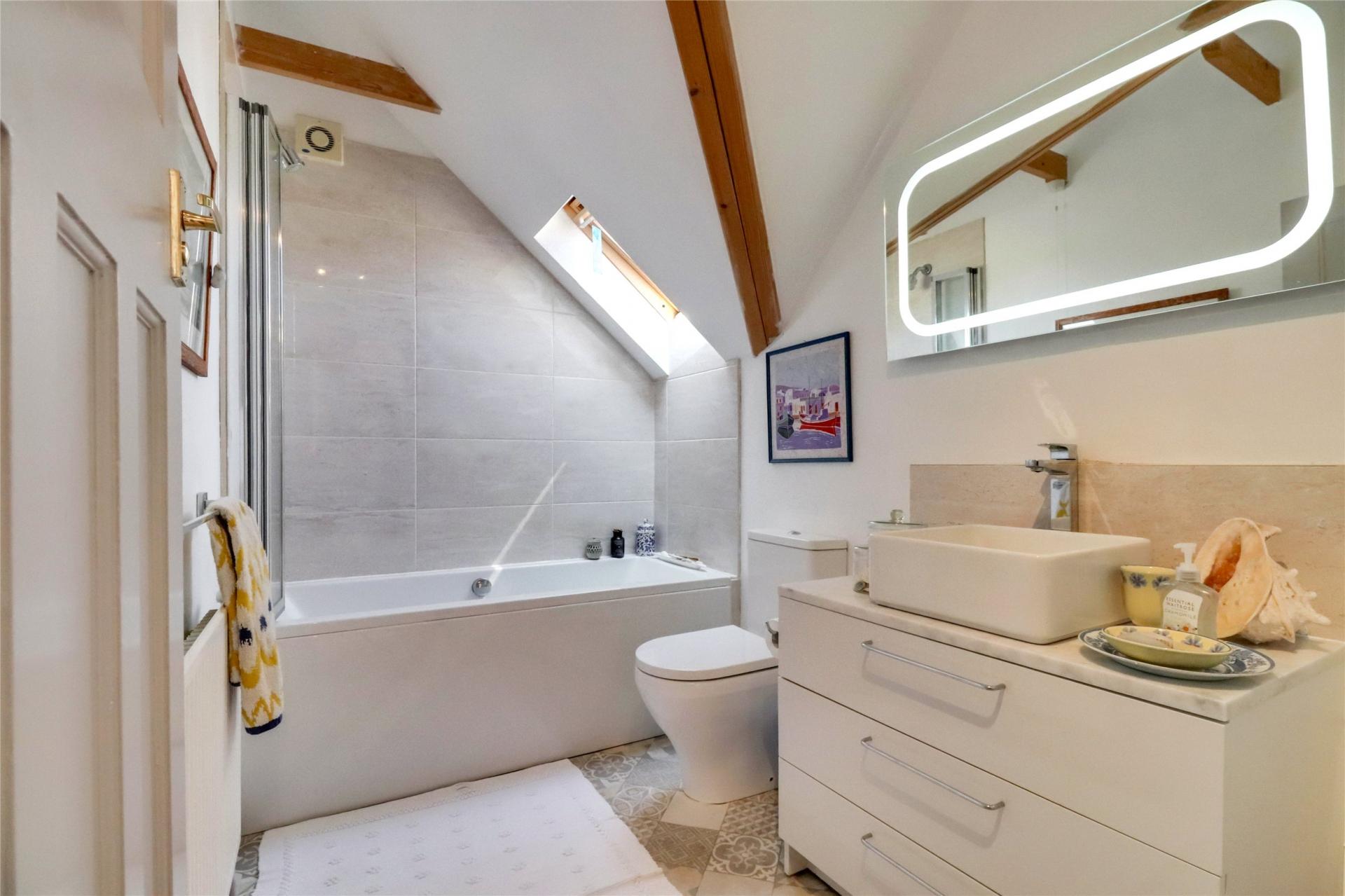 The galleried landing overlooks the hall below and gives access to three generous double bedrooms. The principal bedroom is a well-proportioned space with an en suite shower room including a shower, WC, and wash hand basin. The second bedroom is also a spacious double with useful eaves storage, and the third bedroom, currently used as a home office and guest room, offers flexibility for a range of uses. A family bathroom completes the first floor, fitted with a bath and shower over, WC, wash hand basin, and illuminated mirror.