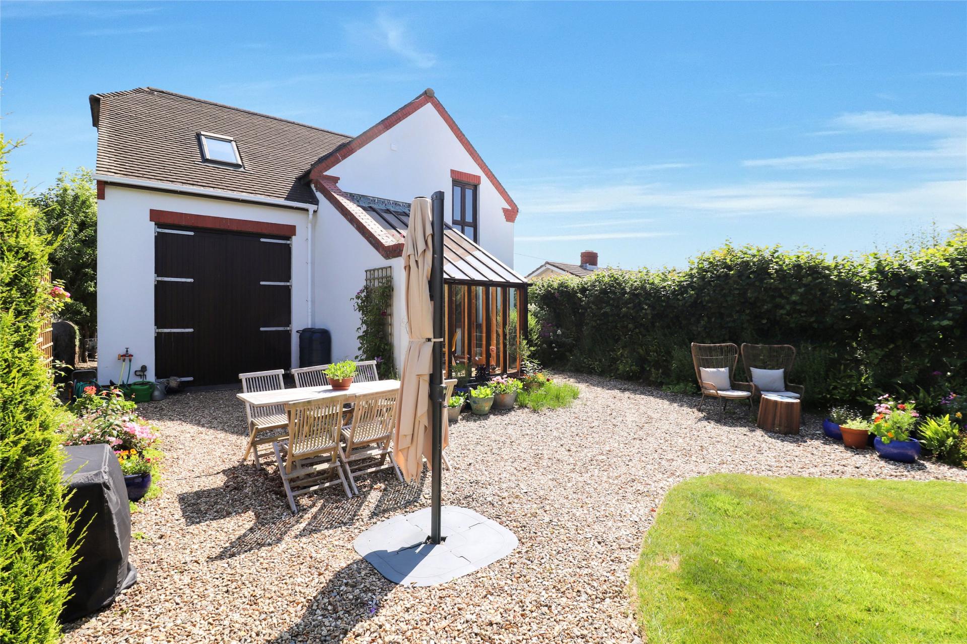 To the front, the large gated driveway provides ample off-road parking and access to the detached garage, which features double doors at both the front and rear.