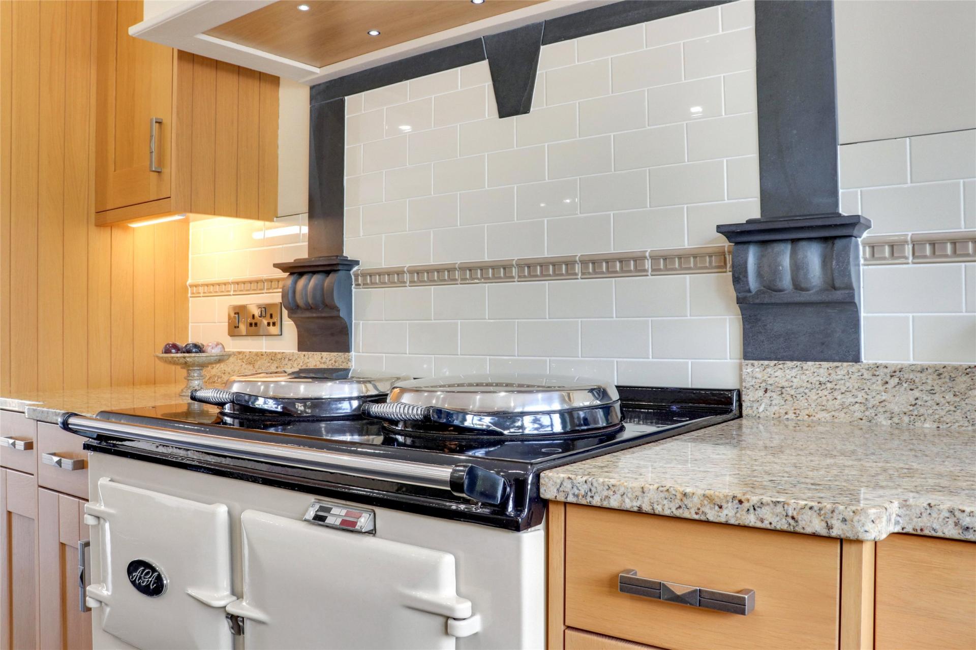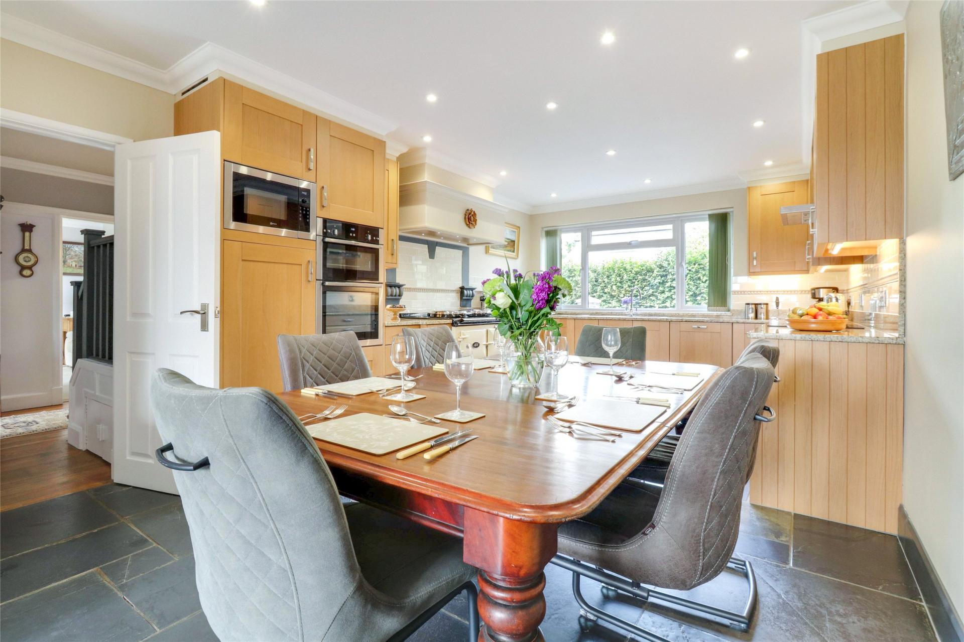 To the left is a beautifully appointed kitchen/breakfast room, spacious and tastefully renovated with modern matching wall and base units, granite work surfaces, an electric Aga, and integrated appliances, including a Neff oven and grill, microwave, dishwasher, and fridge. This room offers ample space for a dining table and sofa, making it a wonderful family room. Double doors open onto the rear garden, allowing you to enjoy the countryside views.