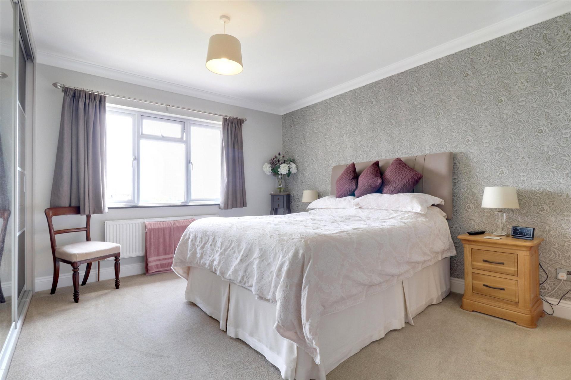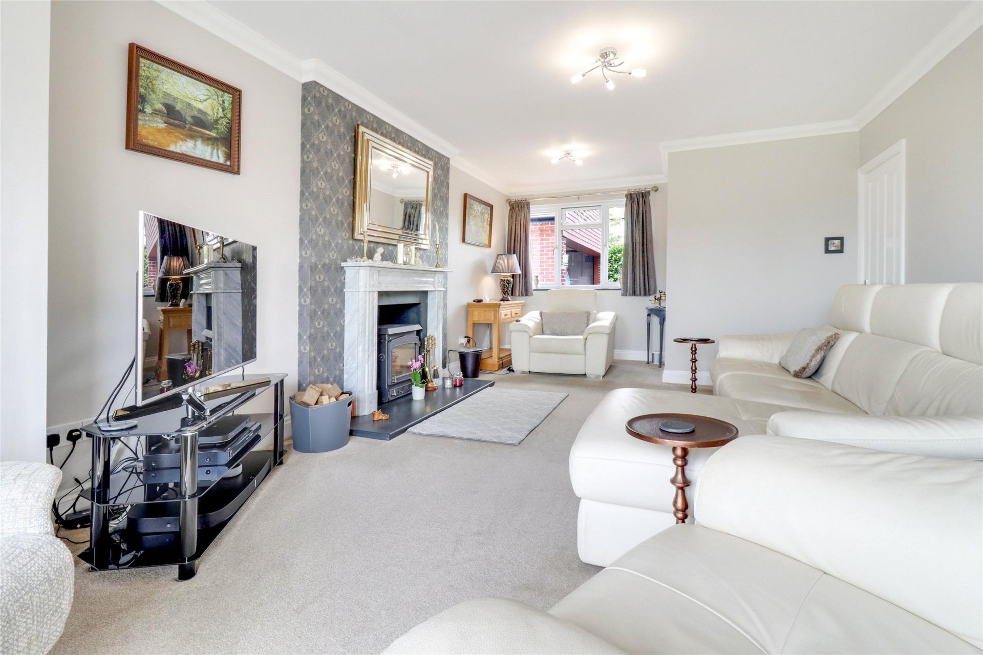 The living room is another well-appointed and spacious area with a feature fireplace housing a wood-burning stove, ample space for sizable furniture, and double doors opening to the beautiful rear garden.