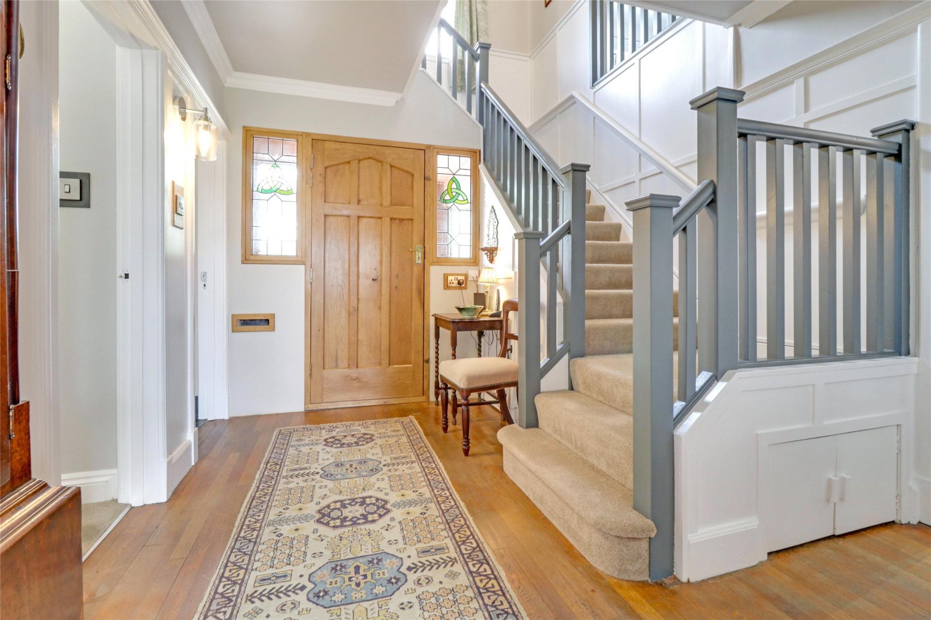 Upon entering, you are welcomed into a porch that leads to a stunning central open hallway with doors to all main ground-floor rooms, a cloakroom and stairs leading to the first floor.