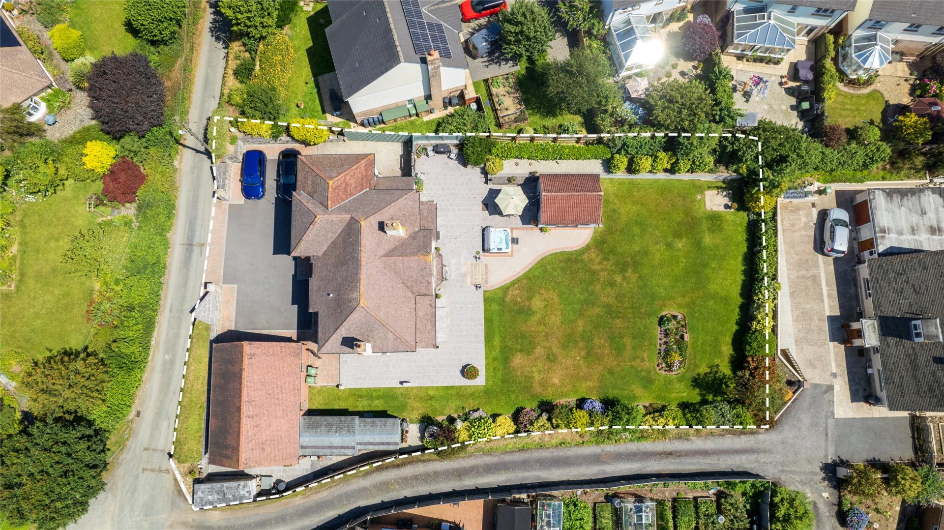 The rear garden is one of the home's standout features, with a south-facing aspect. A large raised terrace overlooks the garden and the beautiful views beyond. Steps lead down to a vast lawn bordered by established plants, shrubs, and flowers. Additionally, there is a well-appointed insulated summer house with electricity and light.