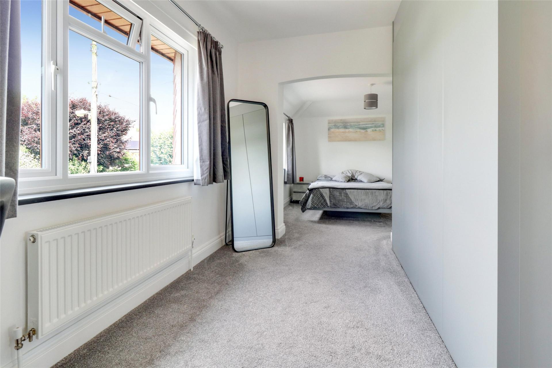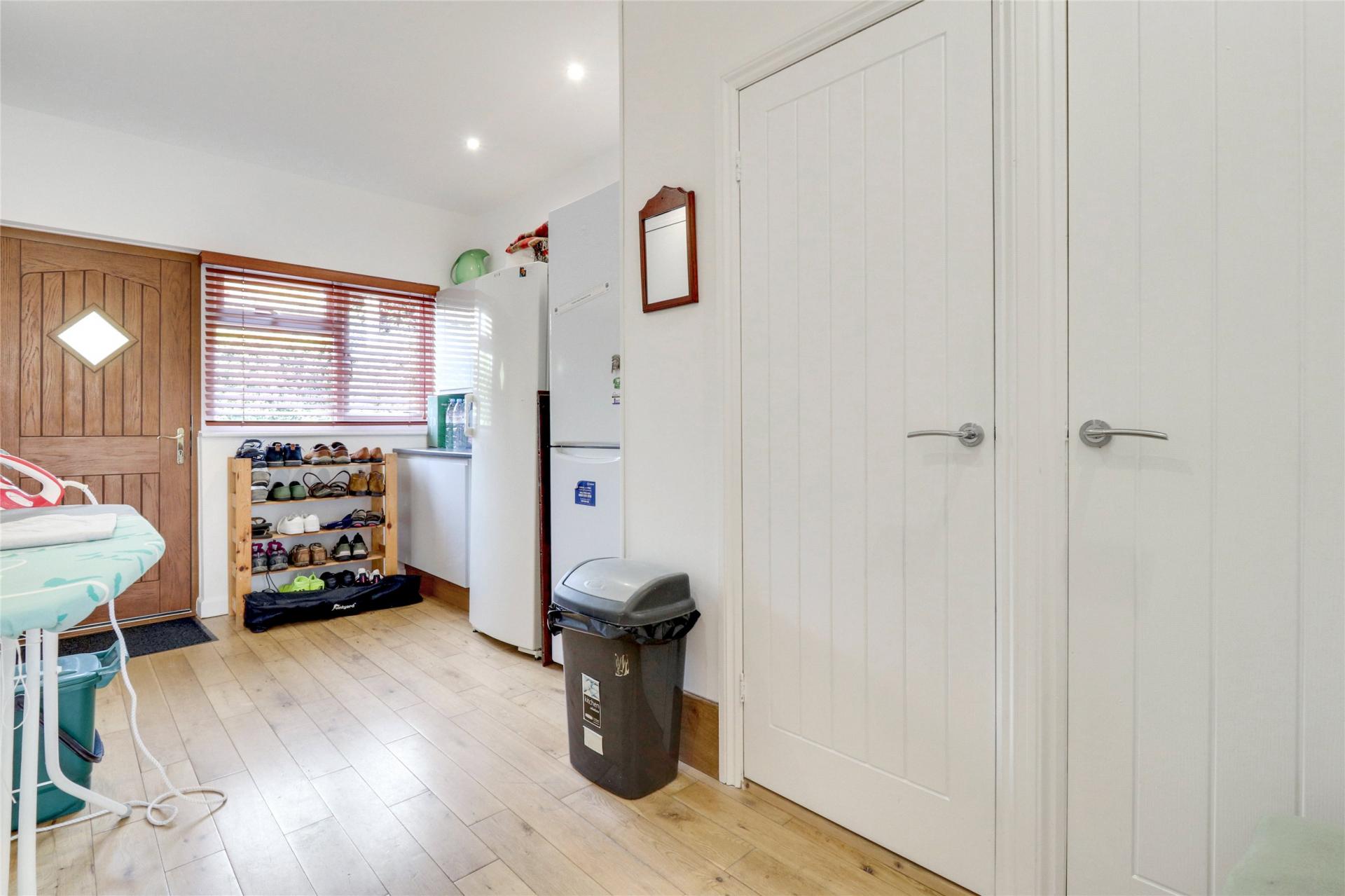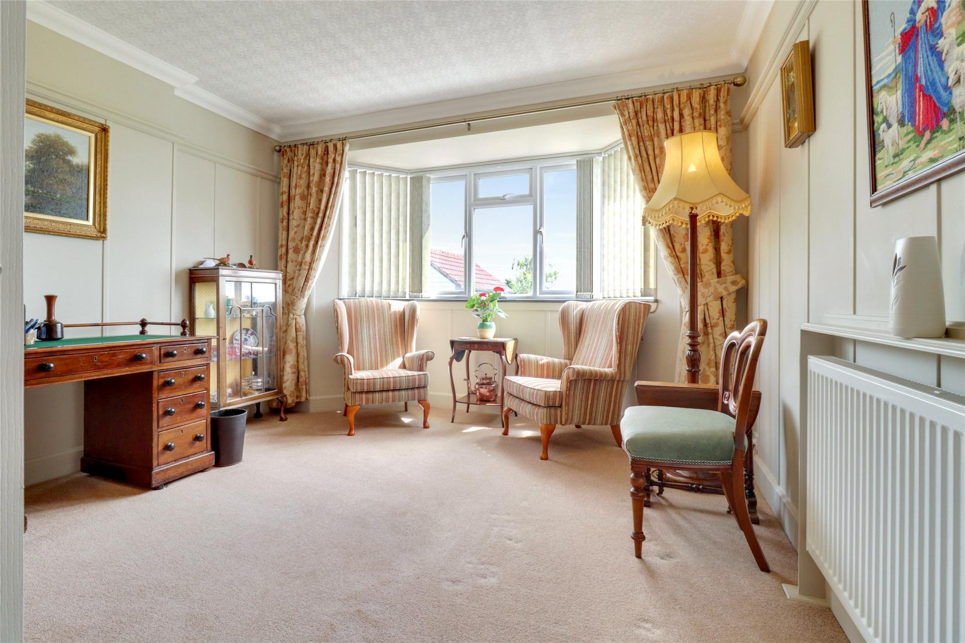 From the kitchen, there is access to a spacious utility room and separate rear lobby, with doors leading to the front and rear of the property, plumbing for white goods, and ample storage space. The formal dining room, currently serving as an office and second reception room, features attractive panelling and a pretty bay window overlooking the rear garden.