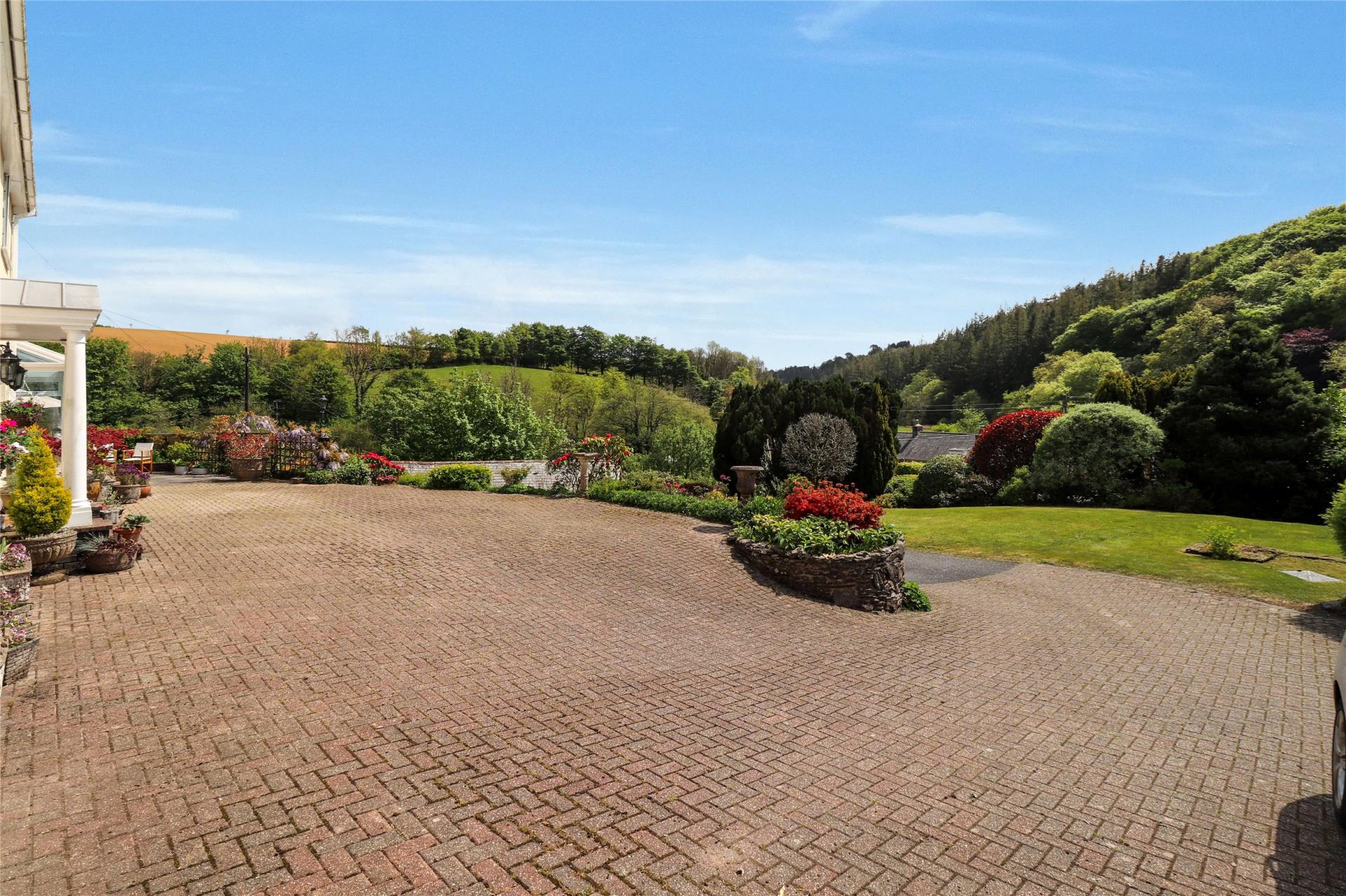 Externally, Mineswood continues to impress. A gated, sweeping driveway curves up to the front of the house, flanked by a large lawned garden on the lower level. This area is bordered by mature shrubs, plants, and trees, and features a central, well-stocked flower bed enclosed by a stone wall.