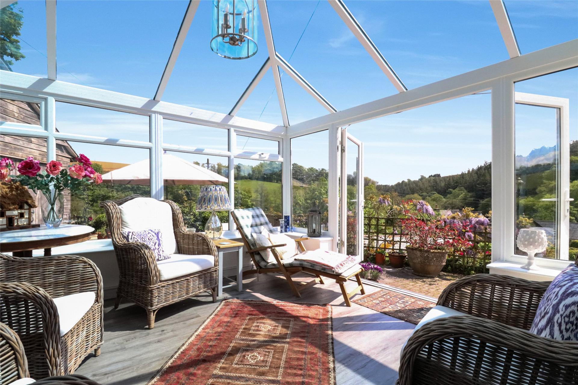 Back off the main hallway is a spacious, light-filled living room. Tastefully finished and able to accommodate sizeable furniture, it centres around an attractive feature fireplace. This room opens into a large conservatory, thoughtfully added by the current owners, providing year-round enjoyment of the gardens and the picturesque landscape beyond. French doors lead from the conservatory to the front of the property.
