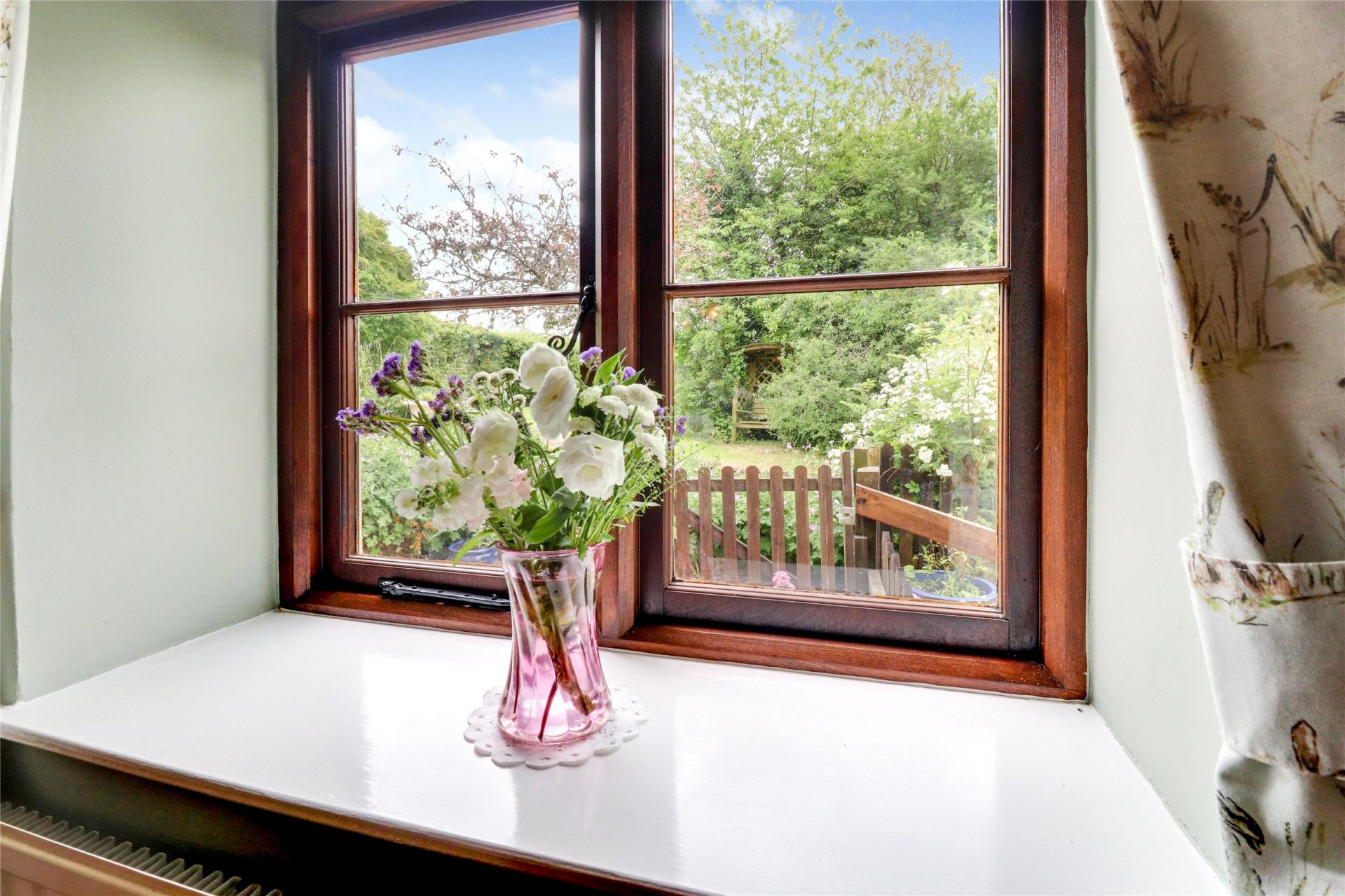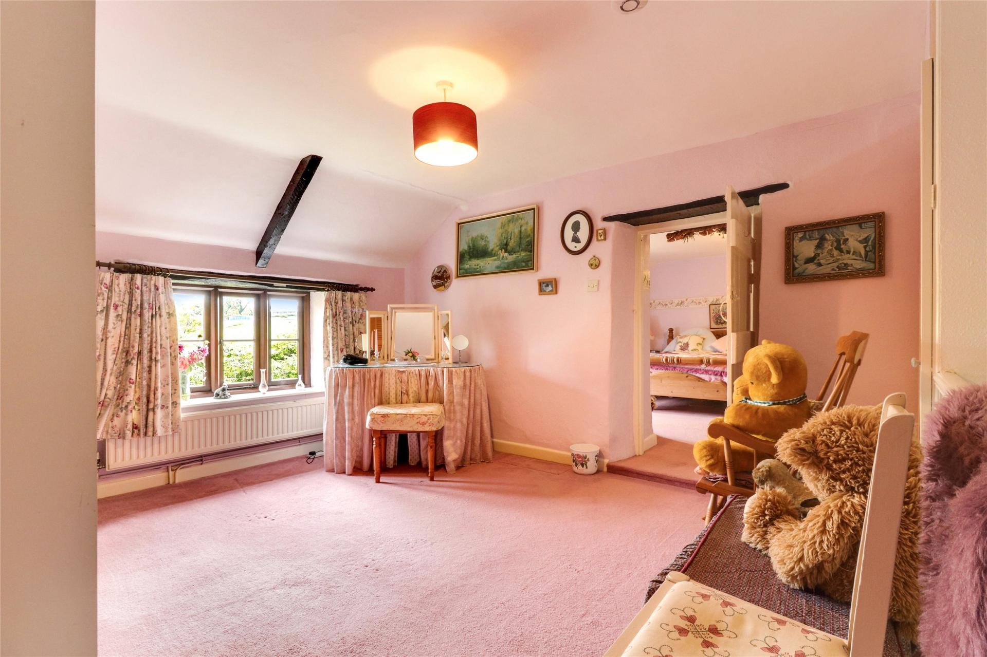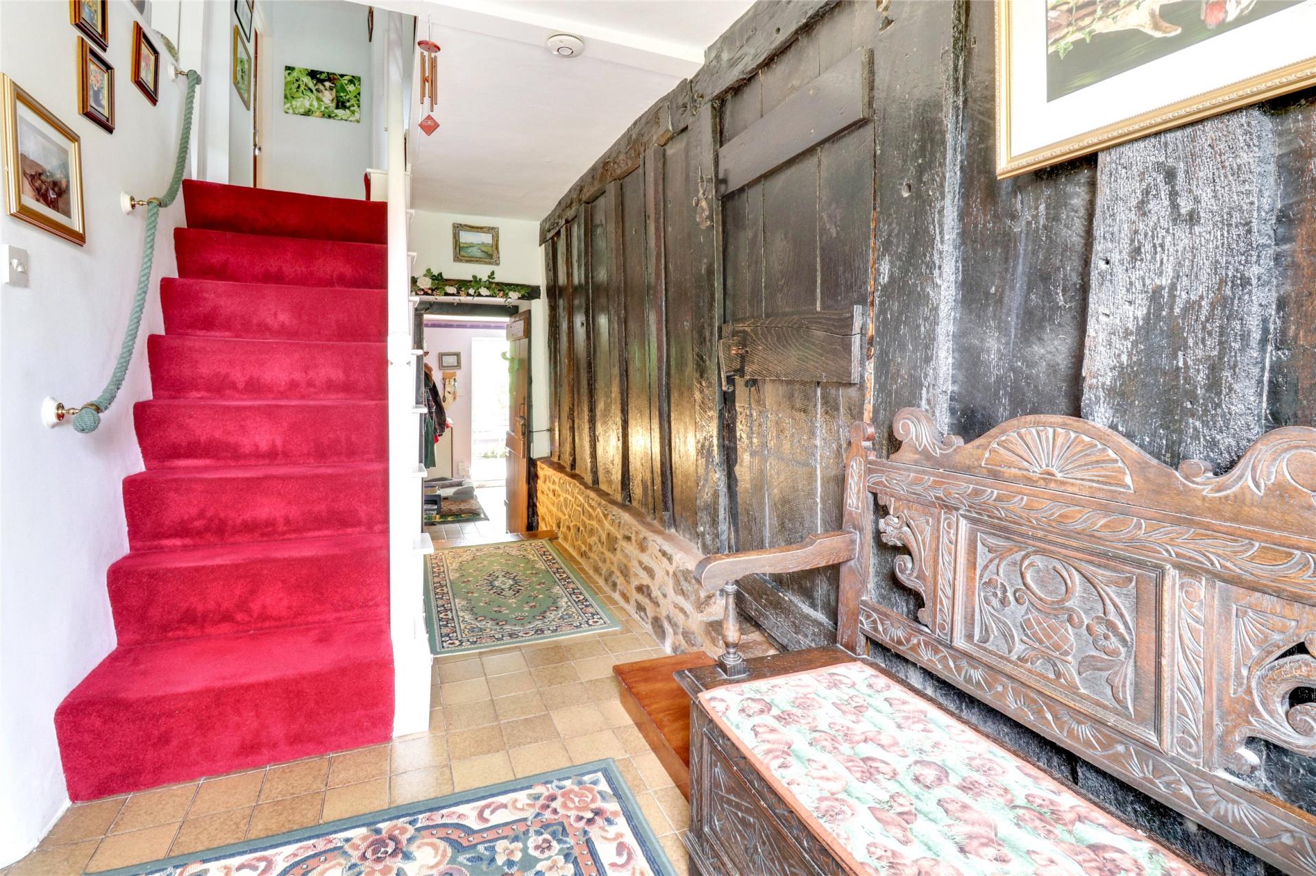 Throughout the property, the careful preservation of its original features ensures an ambiance of historical significance typical of its era. The house features an open porch leading into a cross passage with original oak plank and muntin screens. To the left of the hallway is the dining room, which boasts exposed ceiling beams and a dual-aspect design, making it light and bright.