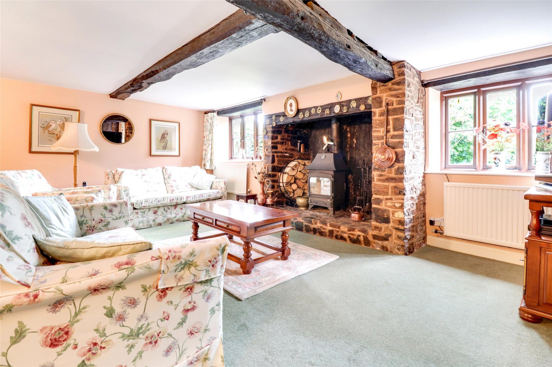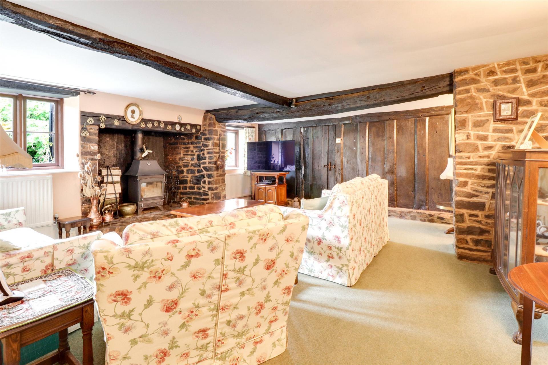 To the right of the hallway, a step leads up to the spacious living room, which features ceiling beams, exposed stonework, and an inglenook fireplace with a wood-burning stove. From this room, a semi-circular head doorway with chamfered edges and an old plank door leads to a second sitting room/snug and a secondary staircase to the first floor.