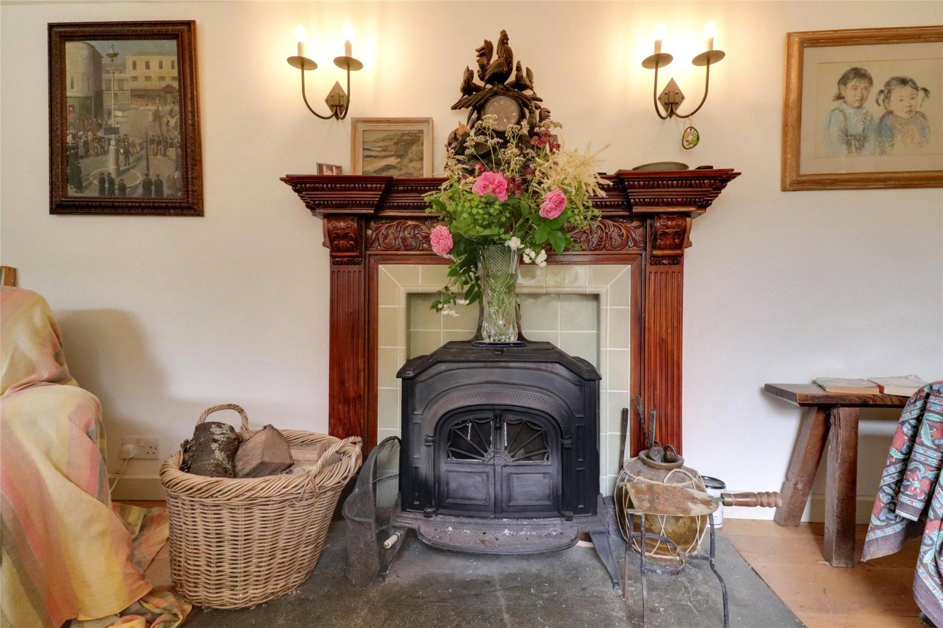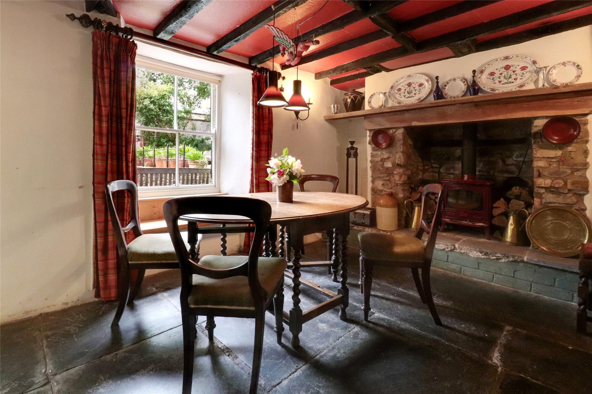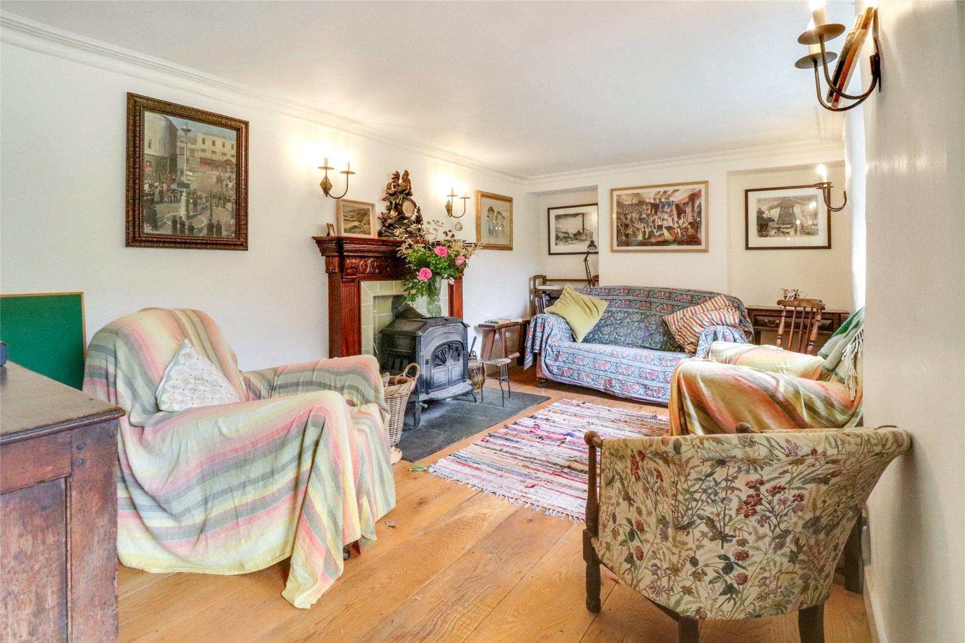Step inside and you are welcomed by a cosy sitting room featuring a wood-burning stove and a staircase rising to the first floor. The character continues into the formal dining room, complete with a traditional inglenook fireplace housing another wood burner. A step down leads to the atmospheric country kitchen, divided into two functional zones. The Dairy to the left includes a sink area with views over the side garden, space for a freestanding fridge/freezer, and access to the rear courtyard. To the right is the principal kitchen, fitted with handmade English Ash cabinetry and a quintessential country staple—an Aga.