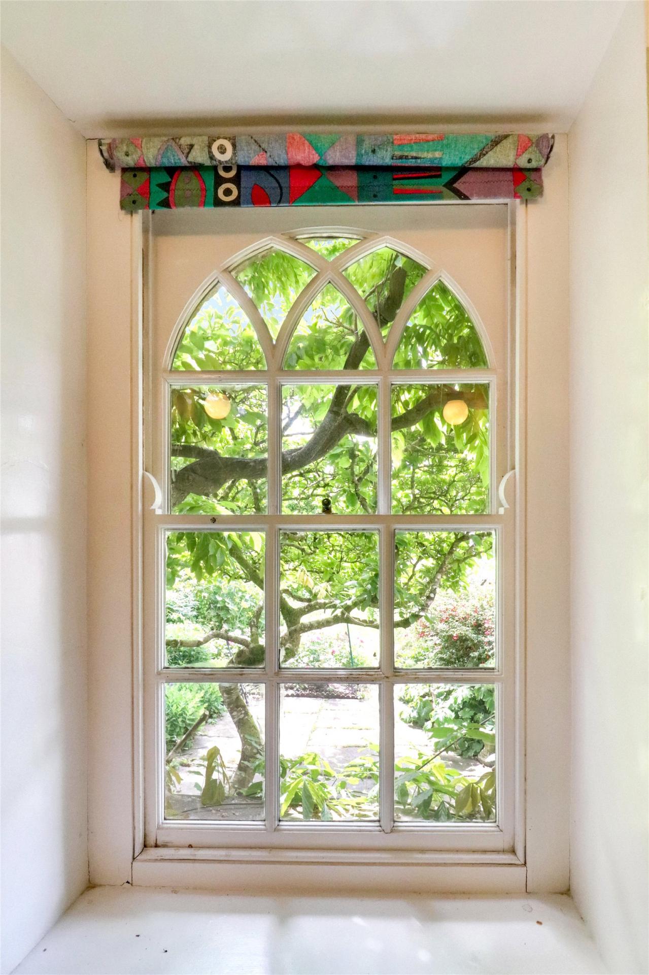 The first floor, accessed via a galleried landing with a striking stained-glass window, comprises two well-proportioned double bedrooms—one currently used as a study—with wonderful views across the gardens to St Mary Magdalene’s Church beyond. The bathroom on this level is equally impressive, featuring a freestanding roll-top bath, WC, and wash hand basin.