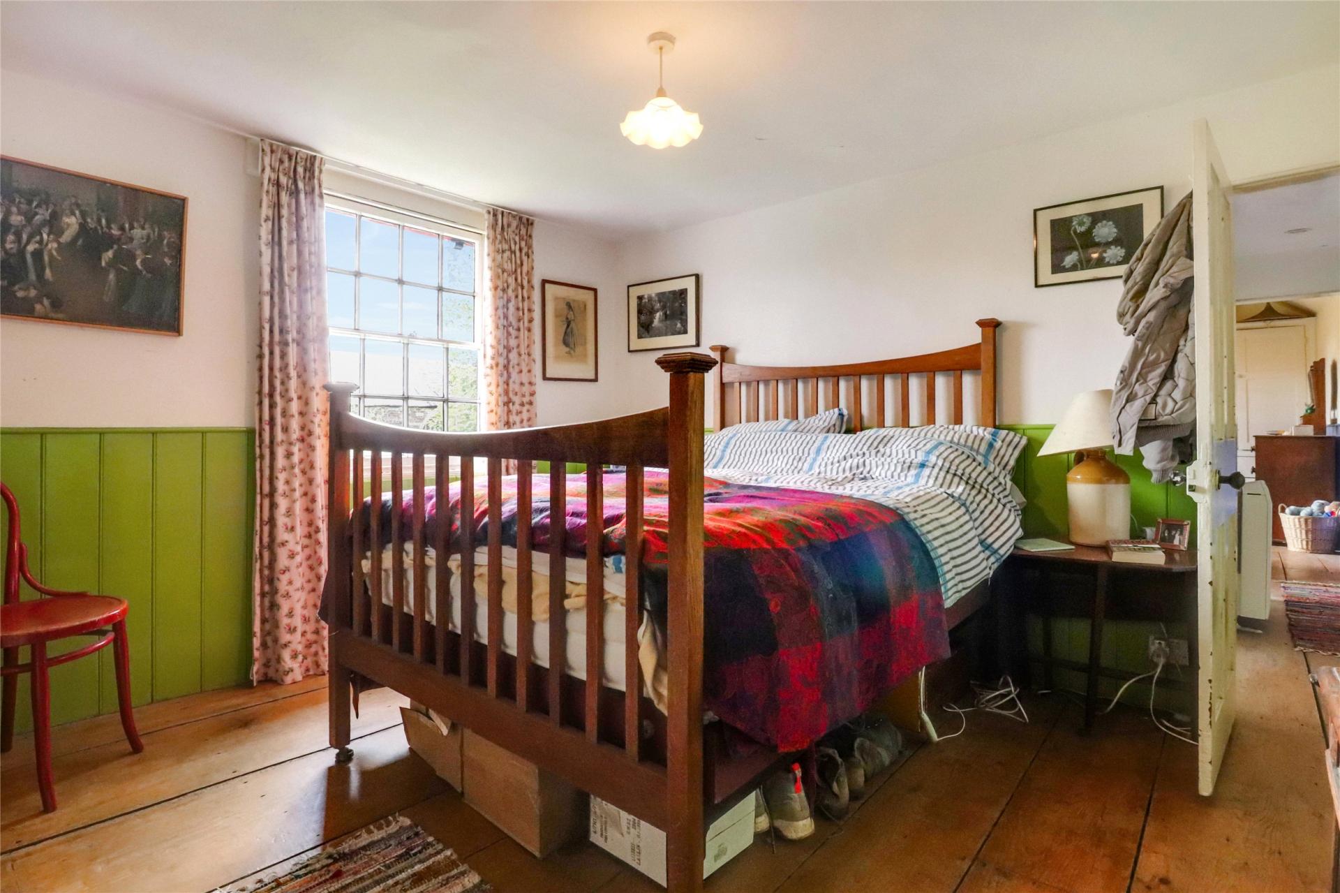 From the galleried landing, a further staircase rises to the second floor, where original elm floorboards and hardwood windows set the tone for three additional bedrooms—two doubles and a charming single. One of the doubles features a stunning vaulted ceiling within the oak timber-framed, lathe-and-plaster upper storey. To complete this level there is a modern shower with a white three piece suite.