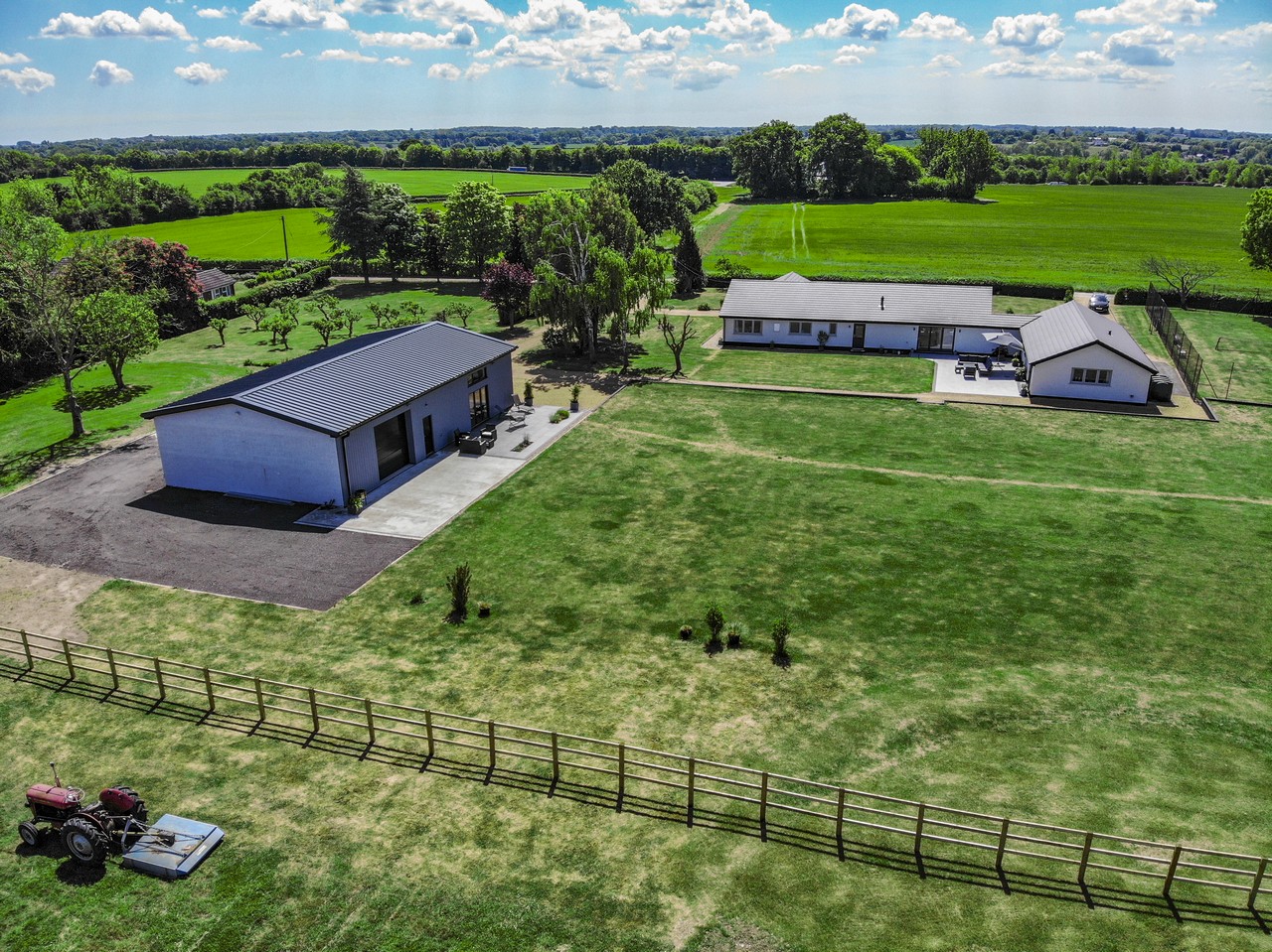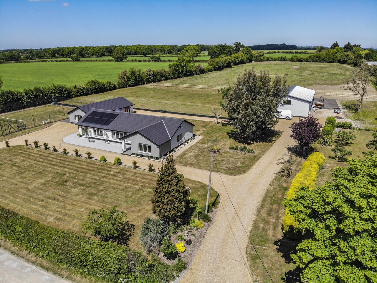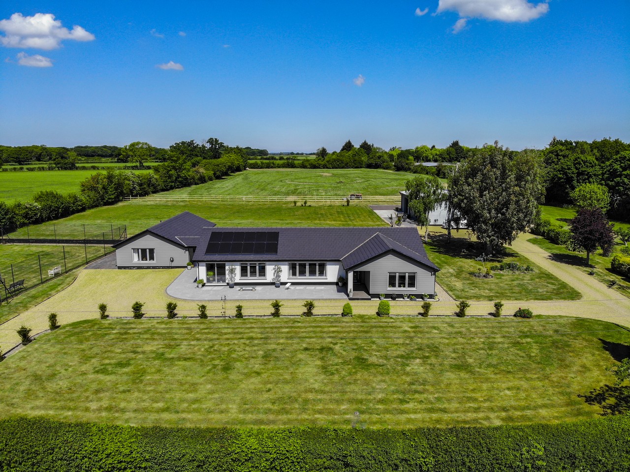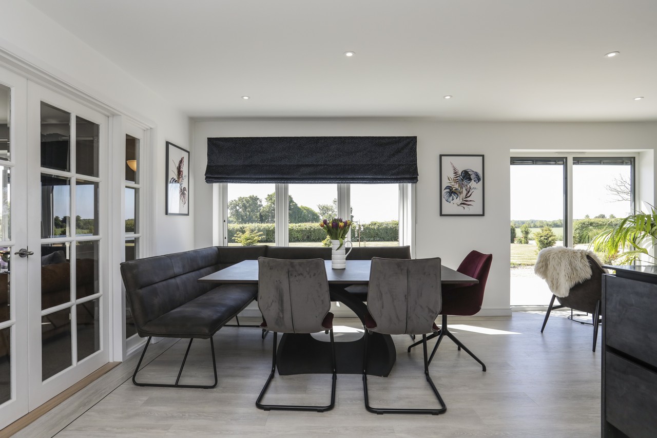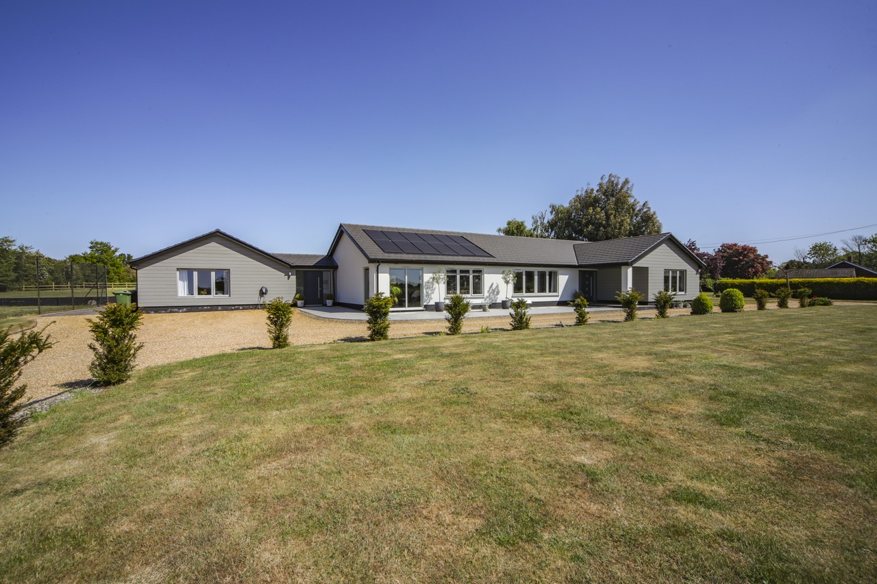 Acres of Luxury. Tucked away in the wide-open beauty of the Norfolk landscape, this beautifully refurbished four-bedroom bungalow offers space to breathe and room to grow. Set in over 6 acres (stms), with a stylish, modern interior, large kitchen diner and an impressive studio barn, it’s ideal for family life, creative pursuits or equestrian endeavours. There’s even a tennis court for sunny afternoon matches. Thoughtfully updated with new windows, roof, heating system and more, this home is move-in ready. Just a short hop to Harleston and Diss for rail links and essentials, it’s a world away from the rush, but doesn’t leave convenience behind.