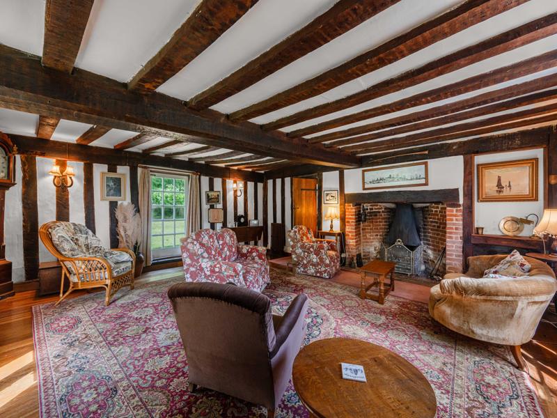 Owned by the same family since 1933 this is a true family home where lives have been forever shaped by this wonderful country residence. The timber framed lathe and plaster farmhouse was renovated in the 60's and 70's when the house was stripped back to its original features revealing Tudor panelling with the original Tudor screens passage, ancient ceiling beams, mullioned windows and handsome inglenook fireplaces. Amazingly all the rooms have full height ceilings apart from one quirky room from kitchen to drawing room which still has the original door. This happy home is now in need of further renovation and awaits its new custodian to write the next piece of its history.