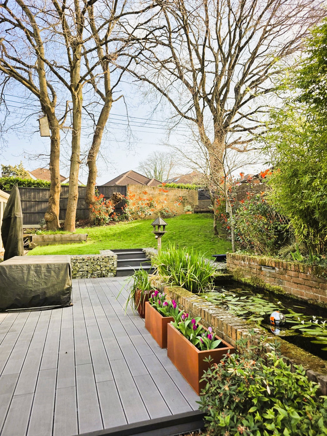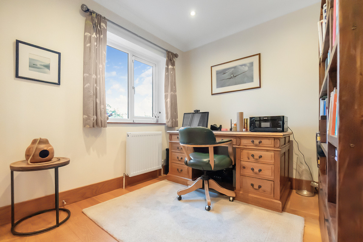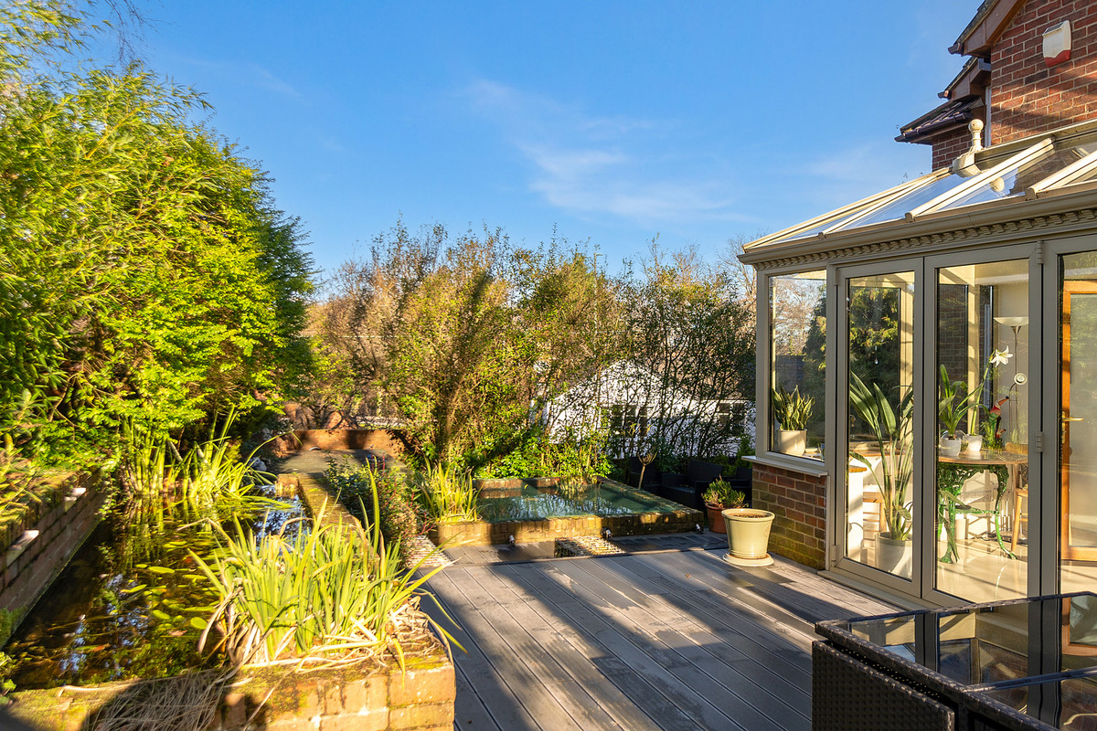 Surrounding the property are meticulously landscaped private gardens, incorporating diverse sections of lawn, artificial turf, well-stocked raised flower borders, and mature garden ponds. The front of the property boasts an extensive block-paved driveway leading to the integral double garage, providing ample parking. At the rear, there is access to two spacious undercroft rooms - one currently utilised as a yoga studio (featuring a full spectrum infrared sauna) and the other as a sizable workshop.