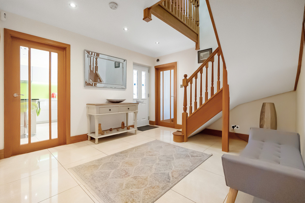 The property revolves around an impressive reception hallway featuring porcelain-tiled flooring and an appealing turned staircase leading to the first floor. The expansive ground floor comprises a sitting room with the focal point being the log burner, along with a separate dining room, both granting access to the expansive conservatory at the rear. The contemporary and custom-designed Leicht kitchen boasts a diverse array of high-quality base and eye-level units with Silestone quartz countertops, including a central island unit. Equipped with fitted Miele appliances, such as a fan oven, combination steam/convection oven, microwave oven with two warming drawers, and a 5-ring induction hob with an extractor fan hood. The kitchen also provides access to the utility room and garage. The kitchen, utility room and hallway feature underfloor heating. The ground floor is further enhanced by a study/home office and a convenient ground floor cloakroom.