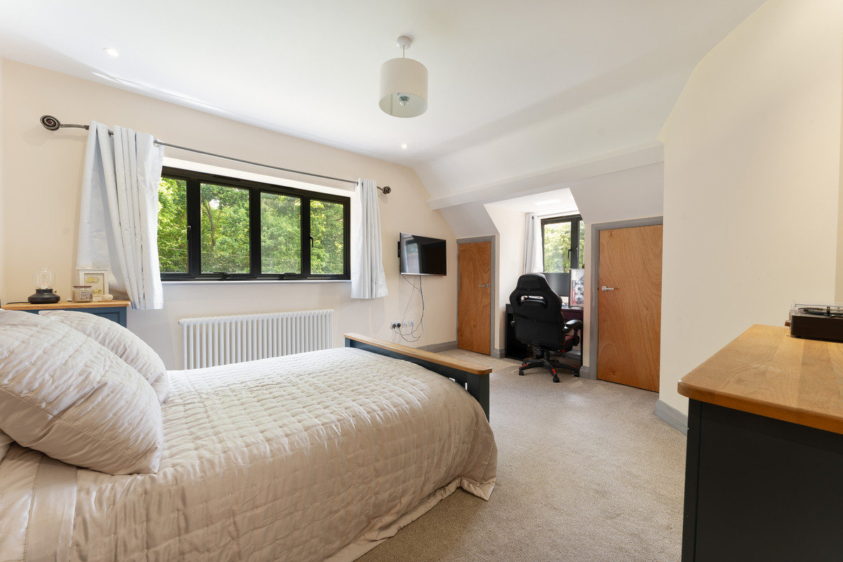 Upstairs, the first-floor features six spacious bedrooms, two with contemporary en-suites and a luxurious family bathroom. The principal bedroom enjoys dual aspects and a private en-suite with both bath and separate shower. A further staircase leads to a seventh bedroom on the top floor with eaves storage and ample natural light via Velux and side windows.